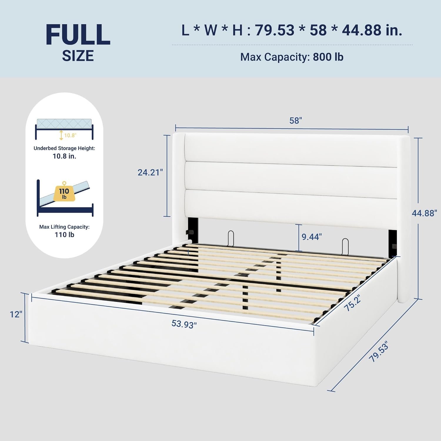 Reviewer: Yanil Rating: 5.0 out of 5 stars Title: Amazing Bed! Absolutely Recommend! Review: I’ve only had the bed for a couple of days but wow! I am impressed, in love, so happy with my purchase so far and absolutely recommend the bed. I purchased the Queen size. The storage is amazing and holds more than what I thought it would, the bed is very sturdy, simple and beautiful just how I wanted. As far as for the assembly, I cannot comment because I paid someone to do it for me as I knew I didn’t have the energy or the time. Old me would have done it on my own. The bed is pretty low but I also do have a very small mattress. I personally don’t mind that at all, but just something to keep in mind if you desire something a lot higher. Pulling the mattress up or down is very simple and easy. Not sure how it would be with a heavy mattress though. I am beyond happy with my purchase! Reviewer: Jen L. Rating: 5.0 out of 5 stars Title: Nice bed frame – VERY impressed! Review: This is a very nice quality bed frame. It was rather simple to put together, directions were straightforward and easy to follow. Took us about 1.5 hours to assemble (that included unpacking the box and making sure all the pieces were there). So far the mattress stays put and doesn’t slide around. Sleeping on it, it all feels solid and sturdy, very supportive.Also, the underbed storage area is a nice bonus and it is very easy to use the lift to access it.TIPS:-When putting together, it helps to lay out all the pieces ahead of time and just be careful to not cross thread any of the screws.-Also, have a basic crescent wrench on hand, the “wrench” tool they provide is useless.-Lastly, the screws are labeled ‘X1’, ‘X2’, ‘X3’, etc… Took us a minute to realize that it was the product number (like the side panels are labeled ‘A’, ‘B’, ‘C’, the screws are labeled as ‘X’ and ‘Y’) and not the the amount needed. (Here in the USA, “X2” means “times two”) That is not the case and was a bit confusing at first.Anyway, We are very impressed with the quality of the bed and pleased with this purchase. Reviewer: Morgan Rating: 5.0 out of 5 stars Title: Amazing frame that you can customize or use as is Review: I live in a small apartment and desperately needed storage. I bought this frame and then bought wood to make the base higher. The wooden frames added 3 extra feet of storage so I have almost 4 feet in total. It is nice that this doesn’t have a lot of support bars (not the slats but the actual bars that touch the ground) so it was really simple to just add a metal support to the ones they had and doesnt limit the storage space or cause you to play tetris to avoid the legs landing on your items. It essentially provided me a small walk in closet. Even with the added frame and extending the bar supports, this bed is rock solid and have been using it for a few months now. I have had no issues at all and i lift it up quite often. Its just as easy to lift it up with the extra box frame as it was when it was first put together. The slats are strong and do an excellent job supporting the mattress without a boxspring and my previous platform bed the slats were further apart and you could feel the matress becoming uneven. There is also no creaking noises which is nice. I store totes and things under it now but you could build shelves or add a bar to hang clothes up like you do in a closet. The possibilities are endless and it’s is way cheaper to DIY the extra box instead of buying those beds with those features built in. Those frames cost around $2000 dollars and i was able to do it all for under $350 and that includes building a 2-step platform to get in bed but you can easily just use a step stool as well. I also love that I can customize it to my needs and am not limited by the built in design if you were to buy something similar. So whether you choose to just use the bed frame as is or if you want to add to it, you can’t go wrong with this frame. The simplicity of the design along with the durability opens up so many options for making it your own. I highly recommend this bed frame. Reviewer: Brandon Smith Rating: 5.0 out of 5 stars Title: Won’t regret! Review: Absolutely amazing, looks so lovely and clean, easy to put together, took around 3.5 hours overall, instructions were clear, tools provided! The quality is amazing, super sturdy, it’s got good support and amazing quality for the inexpensive price of it! Would highly recommend. Reviewer: Carolina E P Rating: 4.0 out of 5 stars Title: Great bed, for teens and adults alike Review: This is a pretty well-made bed! I’ve had this bed for about a bit more than a year, it was easy to put together by myself and is very comfortable. The hydraulic still works fine, and we’ve kept it clean (bought a white one). I would purchase this again. Reviewer: Moni Rating: 5.0 out of 5 stars Title: Fantastic bed Review: So happy with this bed. As someone who’s on a budget but refuses to buy cheaply made furniture, I usually resort to buying stuff off rich people on Facebook marketplace. This bed checks all of my boxes. I was able to build it alone. There was only one step that was a bit tough, which is holding the metal frame up while you install the springs, which I held up by propping the wood slats against the bed- which worked perfectly. The only thing that was difficult was trying to bring the metal frame back down to then put in the slats and then put the mattress on top. I was literally not able to move the metal frame back down no matter how hard I pushed. This was confusing because if you haven’t put on slats yet, and you need it to be up in order to install the spring, that means you need to add slats and then slide the mattress onto it WHILE it is stuck in the up position. I was able to do so because I have a lighter mattress and everything has been working seamlessly.The bed is solid. I have it on a rug and it does not creek or mo