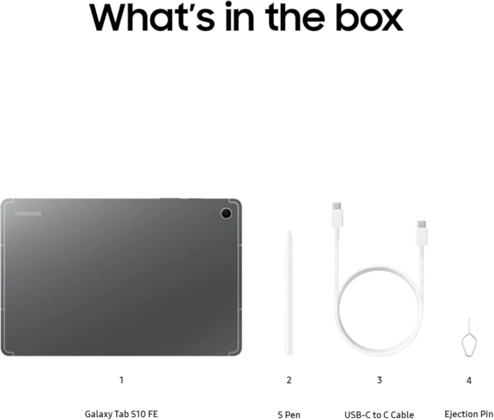 #$% Step up your tablet game with Galaxy Tab S10 FE Series. The perfect downtime tablets, Tab S10 FE Series gives you just the right mix of innovative Galaxy features that you need to manage your lifestyle.¹ Whether you’re working on your weekly calendar or kicking back with your favorite entertainment, you’ll have plenty of room to do what you need on their big, beautiful screens. Need to find something fast? Use Circle to Search with Google² to search anything you see on-screen in a snap, whether it’s that cool pair of shoes your favorite influencer was wearing or that tasty-looking pastry your bestie posted on their story. They’re built to last too, with IP68 water and dust resistance that make them some of the most durable tablets on the market.³ Plus, these tablets let you go for hours⁴ with powerful, fast-charging batteries⁵ that have your back. Once you have a Galaxy Tab S10 FE Series tablet, you’ll wonder how you ever lived without it. ¹Galaxy AI features by Samsung will be provided for free until the end of 2025 on supported Samsung Galaxy devices. ²Works with compatible apps. Requires internet connection; results may vary by uniqueness, clarity and framing of circled image and related factors. Accuracy of results is not guaranteed. Google is a trademark of Google LLC. ³Consistent with IP68 rating, water resistant in up to 5 feet of water for up to 30 minutes. Rinse residue/dry after wet. ⁴Based on local, 720p resolution playback, default video player (full screen), 162 nit brightness, earbud volume 7, Wi-Fi and mobile network off. Results vary with settings, usage and other factors. ⁵Requires 45W wall charger (sold separately). Use only Samsung-approved charger and USB-C cable. To avoid injury or damage to your device, do not use incompatible, worn or damaged batteries, chargers or cables. UNWIND WITH A BIG SCREEN: Kick back and relax with big, bright screens.¹ See every detail of your favorite shows, and get closer to the action on your favorite games with 90hz refresh rate. Plus, dual speakers make everything sound amazing. CIRCLE ANYTHING. SEARCH EVERYTHING: With Galaxy Tab S10 FE Series, you can simply circle anything on your screen to easily get search results on the spot using Circle to Search with Google.² HANDWRITING ASSIST MAKES YOUR UNTIDY NOTES NEAT: Tidy up your handwritten notes with Handwriting Assist.³ It easily straightens, aligns and adjusts the spacing of your words to create neater notes. DOES THE MATH FOR YOU: Make the grades using Math Solver.⁴ Simply use your S Pen to write out an equation on your screen. Math Solver can clean up your equations by turning them into text, just like that. WATER RESISTANT, FROM DROPS TO DUNKS: From droplets to splashes to full immersion in water, Galaxy Tab S10 FE Series is dependably durable.⁵ POWER FOR YOUR ENTERTAINMENT AND TO-DOS: Get big Galaxy power for fast-paced gaming, casual multitasking and everything in between with a powerful processor that delivers rich, smooth experiences. PEN-POINT PRECISION: Write up to-do lists by hand, or enjoy drawing during your free time. S Pen features a responsive design that feels like you’re writing on actual paper so nothing gets in your way when your imagination is flowing. GREAT BATTERY. FAST CHARGING: Keep your time to unwind powered with a long-lasting battery for up to 20 hours.⁶ And when you do need to power up, do it quickly and keep going with Super Fast Charging.⁷ THE POWER OF AI, ON YOUR KEYBOARD: Tap into the power of AI using the quick access hot key on our tablet keyboard.⁸ BIG BACKUP-ABILITY: Have plenty of room for your files with up to 256GB⁹ of storage. Add up to 1 TB more with a microSD card.¹⁰ %$#