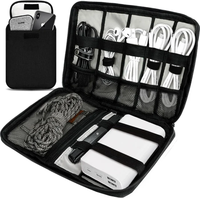 Reviewer: Ben Rating: 5.0 out of 5 stars Title: Surprisingly Good Quality – Great Buy Review: As an IT Professional I’m often out and about fixing equipment wherever it breaks. Certain equipment required specialized tools, some of which can be quite small, so a pouch like this to keep them all together is a life-saver. Not only does the compartmentalization ensure your tools stay separate and safe, but it is much easier for me to see when I am clearly missing a tool from its slot.The overall quality is better than I had expected given the price. Good zippers and a really smooth feel when using it, not to mention the sleek appearance that folks seem to enjoy. I would buy another 4 or 5 of these for various purposes, so versatile! Reviewer: baylie wershey Rating: 5.0 out of 5 stars Title: Good compact size Review: Good compact size while also keeping everything organized Reviewer: Ali Rating: 4.0 out of 5 stars Title: Love it Review: Love this just the right size for what I needed Reviewer: Cheryl t Rating: 5.0 out of 5 stars Title: Perfect for travel Review: I used this pack to travel out of the country this summer. Wow! The organization of all my cords and battery packs was such a help. Reviewer: Deborah Rating: 5.0 out of 5 stars Title: Perfect for any go bag Review: Just got the other day but so far so good. I keep a travel bag for vacations that way I never need to look and pack cords, battery packs and charging tower. Keeps everything in one place and easy program what you need Reviewer: Jeanie Rating: 3.0 out of 5 stars Title: Nice Review: Nice but too small for my needs Reviewer: VictorygalPasMan Rating: 5.0 out of 5 stars Title: Good protective organizer for your loose charging and connection cables. Review: This case is simple and works well for organizing cables and is even large enough to house a battery pack. It really helped clean up my soft briefcase. It isn’t really big enough for most laptop power supplies, but is great for all the smaller cables. Reviewer: Book Lover Rating: 5.0 out of 5 stars Title: Great case to hold all my Review: My sister visits the sick in the hospital and needed this type of organizer pouch to carry her notes and information when visiting the sick. She loves this organize because it is small enough to fit in her purse and large enough to carry her notes and calendar. Reviewer: amr adel Rating: 5.0 out of 5 stars Title: Review: perfect Reviewer: Mohamed Walaa Eldeen Rating: 4.0 out of 5 stars Title: Review: It did its purpose. It’s a little bit hard to put the cables in place but overall it’s good. Reviewer: Yahya hamdy Rating: 3.0 out of 5 stars Title: Review: Ok material but doesn’t have the sd or the pocket outside also came with red colour not black Reviewer: Mostafa Abd Elmohsen Rating: 1.0 out of 5 stars Title: Review: خامه سيئه جدا لانها نوع اخر غير المعروض Reviewer: Aya Emad Rating: 1.0 out of 5 stars Title: Review: مفيش امانه جايه ناقصه ولما رجعتها عملتوا انها ضاعت يعنى سرقه علنى