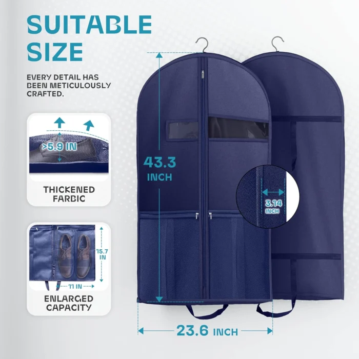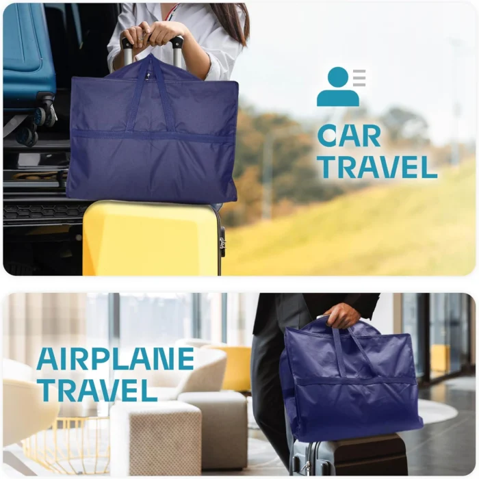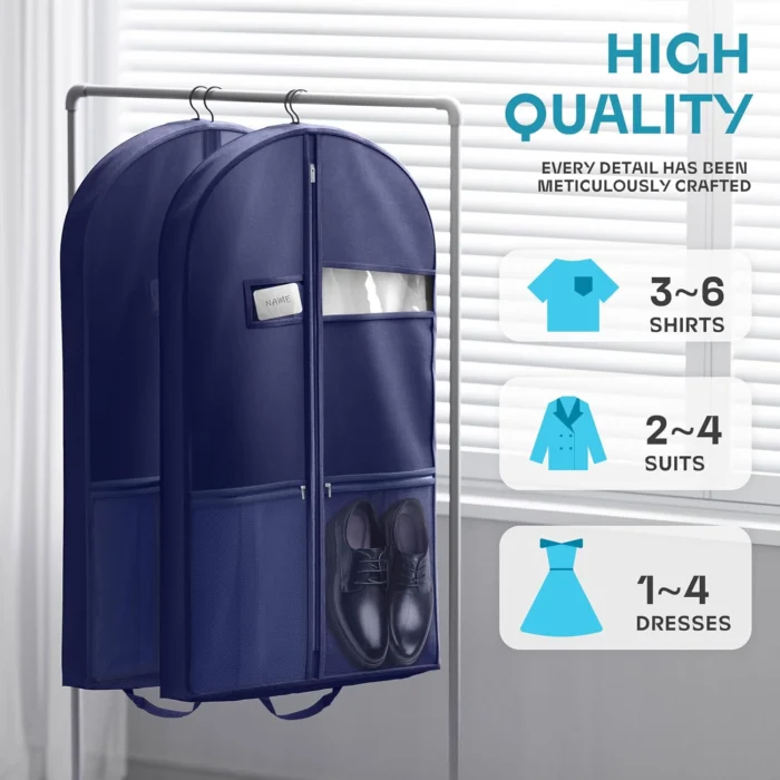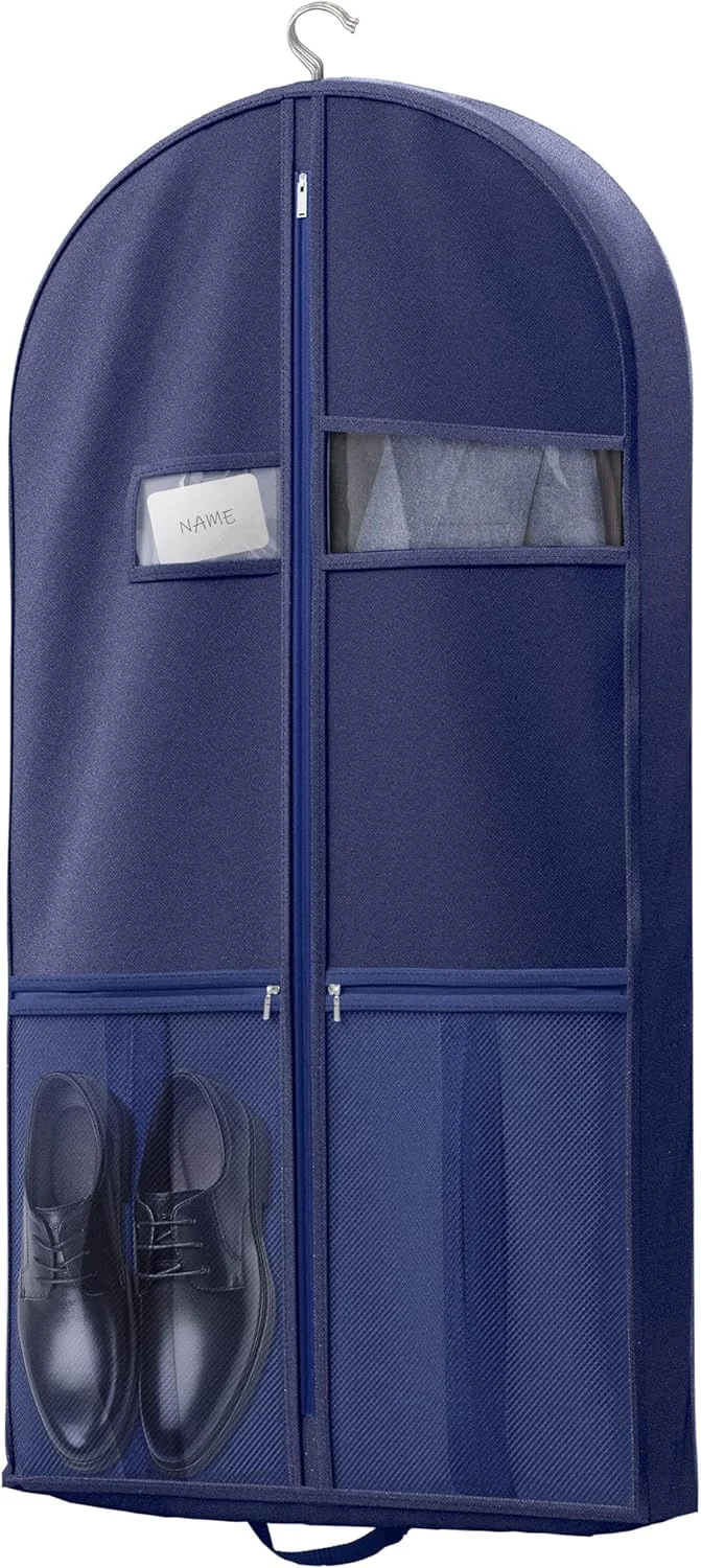 Reviewer: Ryan Rating: 5.0 out of 5 stars Title: Great product, works great! Review: Works and looks great! My favorite part is that I can also store my shoes in the designated zipper pockets. Worth the buy, especially considering the price. Reviewer: Charlotte Rating: 5.0 out of 5 stars Title: Makes Traveling With Suits & Dresses A Breeze Review: This Lazebox 43” Travel Garment Bag is fantastic! It made traveling with suits and dresses so much easier, keeping everything organized. The quality feels very good and durable. I love the zipper pockets on the front — perfect for shoes or other accessories. It is practical, and well-made — highly recommend for anyone who travels!• My husband suits fit great.• My dresses fit great as well, I carefully folded the bottom of my maxi dresses and set inside of the bag.• It’s light weight itself.• The color is true to the photo.• It provided good protection for our clothes while traveling. Reviewer: Anita Jindal Rating: 4.0 out of 5 stars Title: Good bag, lots of storage Review: The product is as advertised, bag is sturdy and will hold multiple suits. The handles are a good idea for carrying.Nit pick: wish the bag had a small clear window to see what is in it. As it is, have to open the zipper and go through, also small ventilation holes for air to circulate, it will prevent clothes from smelling. Reviewer: Bryan Rating: 5.0 out of 5 stars Title: Durable, Spacious, and Travel-Ready—Great Value Garment Bag Review: I picked up the Lazebox 43″ Travel Garment Bag to protect suits and coats during travel, and it’s exceeded expectations. The material feels heavy-duty and well-made—definitely built to handle repeated use without tearing or fraying. The black finish looks sleek and professional, and the stitching is solid throughout.The size is perfect for full-length garments like tuxedos, dresses, and long coats. Inside the main zipper compartment, I can comfortably fit two suit jackets, a few shirts, and a pair of pants—plenty of room for a full formal outfit. It keeps everything wrinkle-free and protected, even during longer trips.The accessories zipper pockets are a great bonus. On the left side, I’m able to fit a pair of size 14 dress shoes. It’s a snug fit, but not too much—as long as they’re positioned properly before zipping, they fit just fine. On the right side, I keep my ties, which stay neatly organized and easy to access.It folds easily for storage and doesn’t take up much space when not in use. Whether you’re packing for a wedding, business trip, or just organizing your closet, this bag delivers on quality and convenience.Between the sturdy build, smart design, and added storage features, it’s a fantastic value. If you need a reliable garment bag that’s simple, functional, and travel-ready, this one’s a winner. Reviewer: Marie D. Rating: 5.0 out of 5 stars Title: Great Quality Garment Bag — Fits My Dress and Shoes Perfectly! Review: I’m so impressed with the quality of this garment bag! The material feels durable and well-made, and I love how spacious it is. I was able to fit my entire dress and my shoes inside with no problem. It keeps everything protected and organized while traveling. Definitely worth it if you need something reliable and easy to carry for special occasions or trips. Highly recommend! Reviewer: Amazon Customer Rating: 5.0 out of 5 stars Title: Great garment bag with lots of storage Review: I bought this to hold my Halloween costume because I have a lot of parts with it. It held the dress, the cape as well as all the makeup, the undergarments and the wig. Was impressed with how much this garment bag will hold. Easy to keep all my Halloween costume accessories together in one place. Reviewer: YodaReadsLit Rating: 3.0 out of 5 stars Title: Good until it wasn’t Review: It was great until the 3rd use when the zipper broke. Reviewer: Amazon Customer Rating: 5.0 out of 5 stars Title: Good value purchase Review: Worked great. Shoe pockets are very useful. Reviewer: Brendan Rating: 5.0 out of 5 stars Title: Review: Got this for a nice suit that didn’t come with its own bag. Included pockets are great for keeping any accessories with it when travelling.Build quality feels good, so you can have piece of mind that your suit or dress will make it to your destination in tact, or won’t get damaged when stored for a long time. Reviewer: Lauren Fryer Rating: 5.0 out of 5 stars Title: Review: Great item for the price and delivery was excellent Reviewer: Dylan Rating: 5.0 out of 5 stars Title: Review: Great Reviewer: Little Miss Researcher Rating: 2.0 out of 5 stars Title: Review: Very cheap material. One of the two pack has no zipper, the zip material is sewn in on each end with no zipper to be able to open or close.Would not recommend. Reviewer: Jon-Michael Payne Rating: 1.0 out of 5 stars Title: Review: COMPLETE GARBAGE.zipper came broken, doesn’t zip up because it’s been folded up and the zip is all bent. Zip derails at 5 different points as you zip it up. Get something else