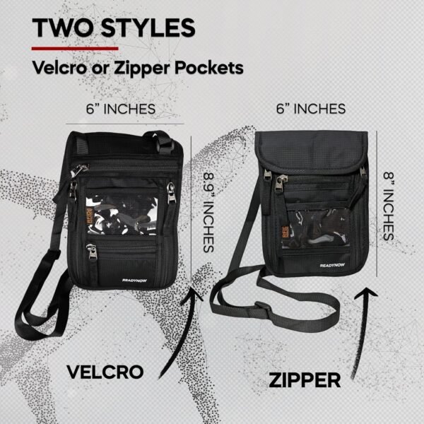 Review: I ordered the one without the velcro on it. This Travel Neck Wallet pouch is perfect for when I’m on one of my train or plane journeys. The pocket in the back is big enough to hold my Samsung S22 Ultra phone (though there’s no zipper on the back pocket) which is a big phone if you’re not familiar with it. The back of the pouch even has a thin layer of cushioning so my phone isn’t getting banged against me too hard if I have to run or jog to the next terminal or gate.There are 4 zippered compartments for my train/plane ticket, ID, credit cards and some cash. The front has a clear pocket for slipping an ID in, but it doesn’t have a zipper or flap on it and therefore, I don’t feel entirely secure putting my ID in it. With all the other compartments though, there’s still plenty of space to tuck my ID in one of the zippered pockets while I toss my lip balm and gum into the clear pocket.I wear the pouch around my neck like a lanyard and it’s perfect. The strap is even adjustable which is another nice feature of this pouch. I can make the strap long enough to wear the pouch crossbody over one shoulder.I really like that it has the RFID blocking feature though I only see that silver-like RFID fabric on the inside of the large pocket on the front and one of the zippered side pockets. It doesn’t look like all of the pockets have the RFID blocking feature, which is my only gripe about this pouch.Other than that, this pouch is exactly what I was looking for and it works great for fast, easy access to the bare essentials while traveling.