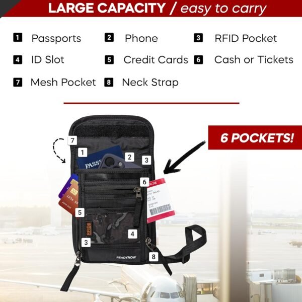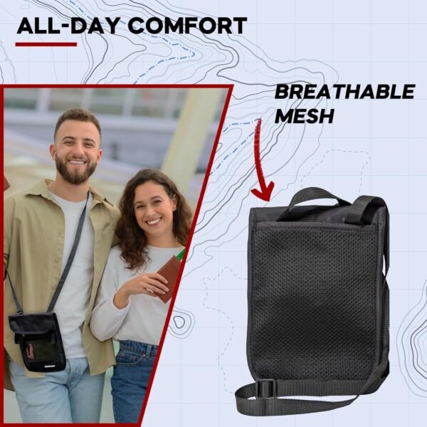 Travel Neck Wallet Passport Holder with RFID Blocking – Lightweight Pouch, Secure Organizer with 3 Zipper Pockets, ID Window, Adjustable Strap, Breathable Mesh Back – 8″x6″