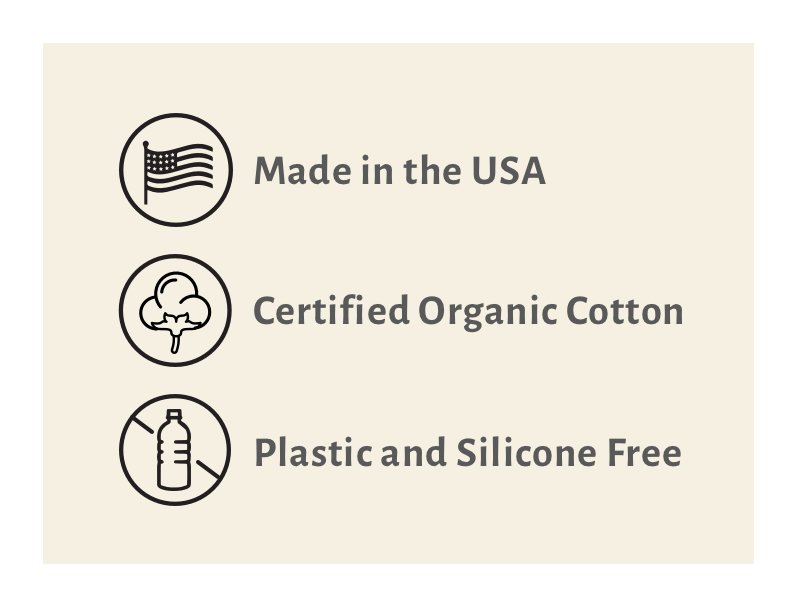 | Material | GOTS Certified organic cotton, sustainably harvested beeswax, organic jojoba oil, and tree resin. |