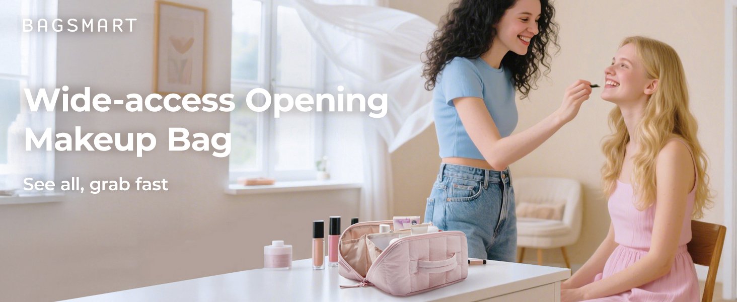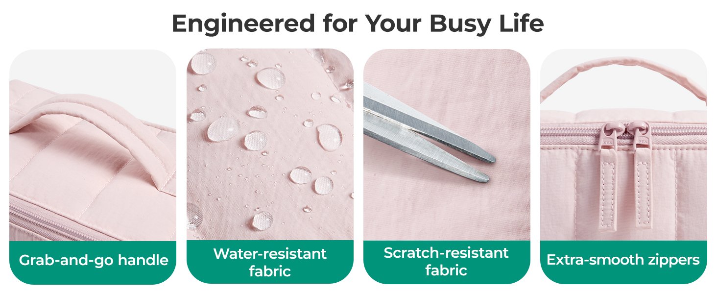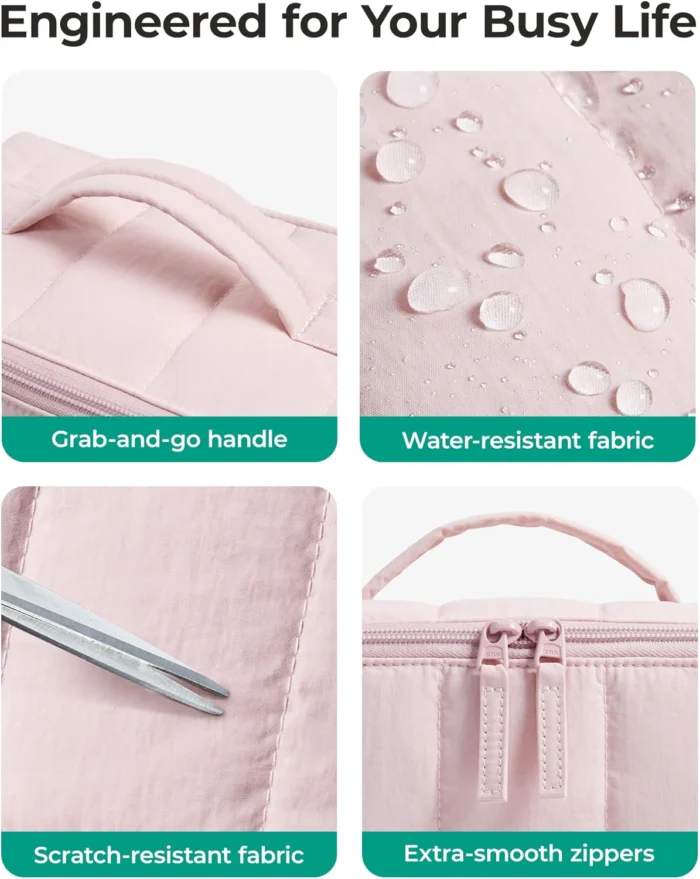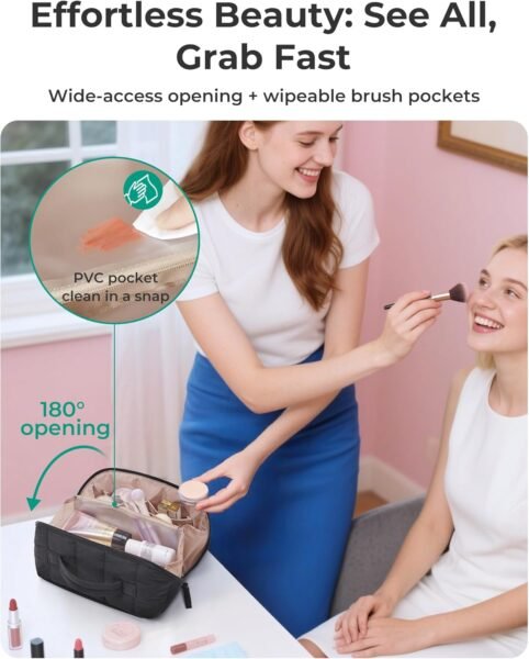 Full-Open Design for Easy Access: Experience ultimate convenience with our makeup bag’s full-open design. This feature allows you to effortlessly view and reach your cosmetics and toiletries. No more digging through a cluttered bag—simply unzip and find what you need in seconds, making your daily beauty routine smoother and more efficient.