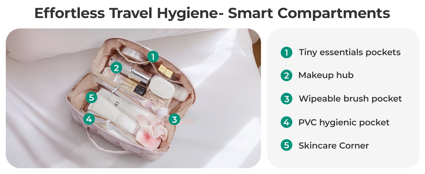 Smart Storage Solutions for Ultimate Organization: Stay organized with our thoughtful storage features. The bag includes a wipeable brush pocket for easy cleaning, tiny essentials pockets for small items, a PVC hygienic pocket for cosmetics, and a dedicated skincare corner. This arrangement allows you to keep your makeup and toiletries neatly separated yet easily accessible, ensuring you can find everything at a glance.