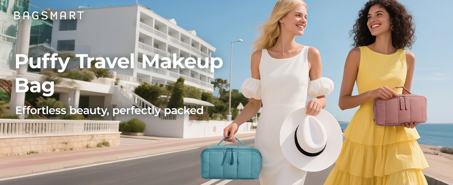 @#@ BAGSMART Travel Makeup Bag for Women, Portable Water-resistant Cosmetic Case, Puffy Padded Make Up Organizer Pouch, Open Flat Toiletry Bag for Toiletries, Brushes, Brown @@@
