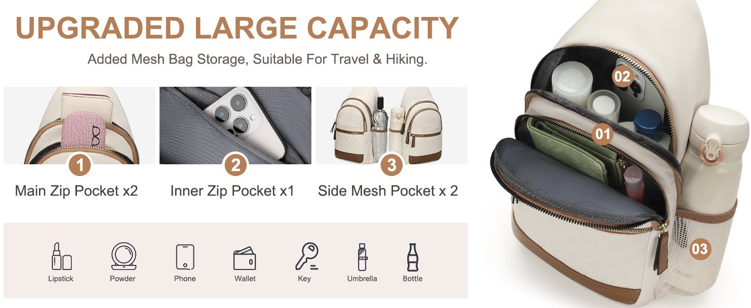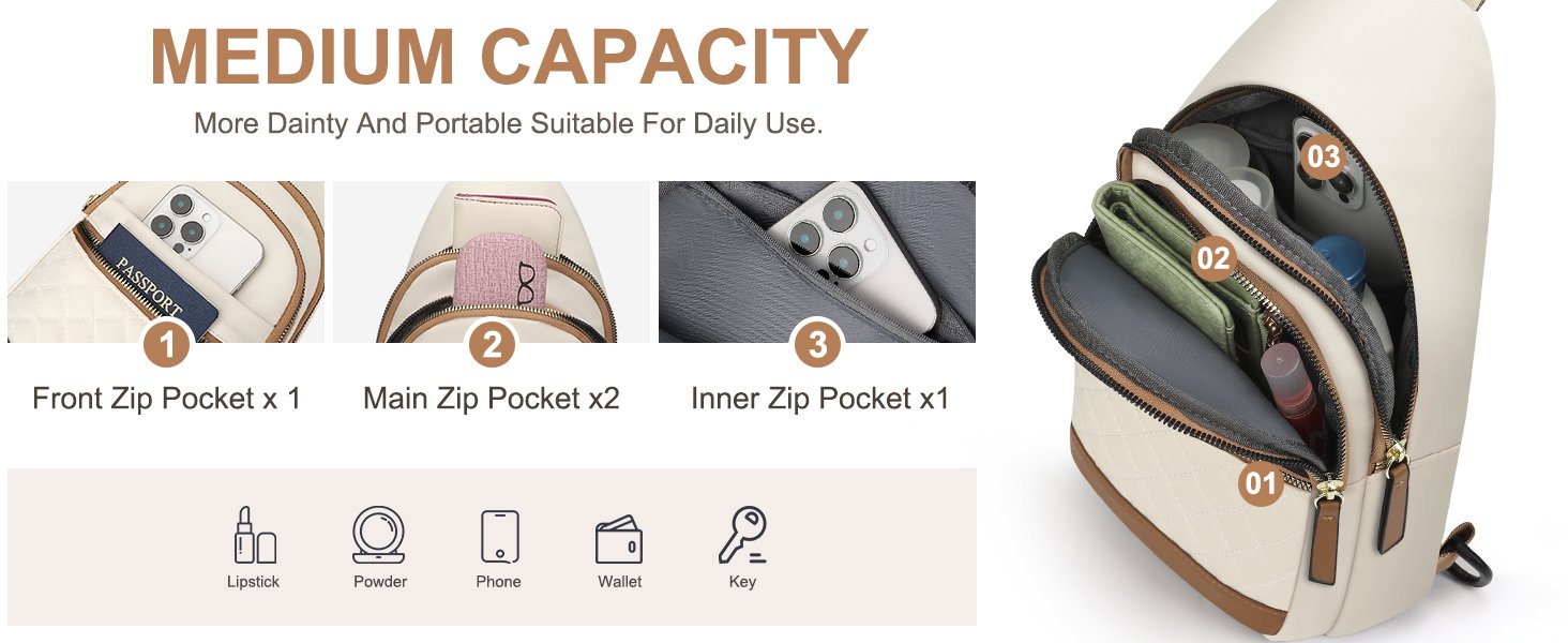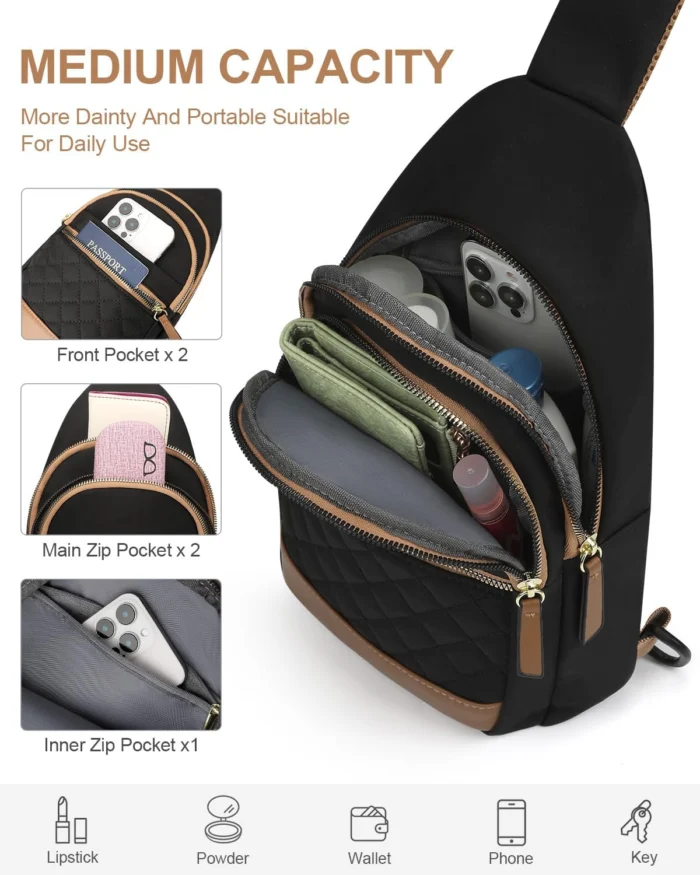 5-Pockets Design: Our crossbody purses for women features a well-structured 5-pocket layout, keeping essentials organized and accessible. The two main zip compartments offer ample space for daily necessities while the interior zip pocket secures valuables. The magnetic snap pocket allows easy one-handed access, and the front zip pocket keeps small items within reach. Designed for convenience, our crossbody sling bags for women enables a smooth and efficient organization, making your journey easy