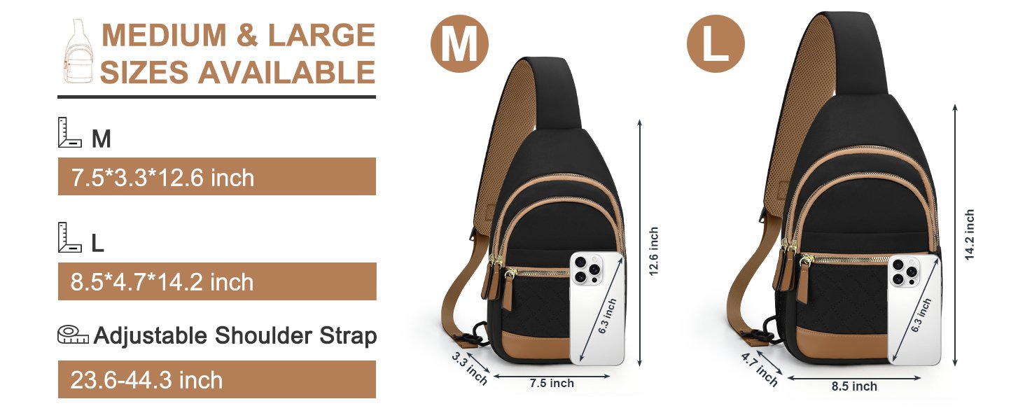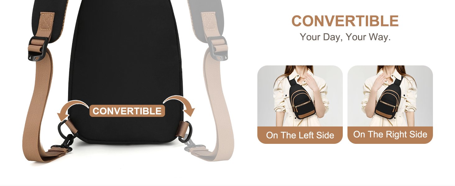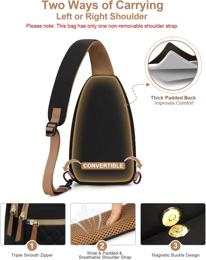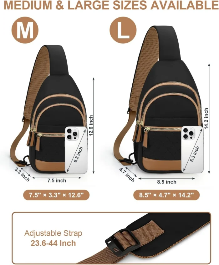Medium Capacity Crossbody Bags for Women: Our medium sling bag measures 7.5″L × 3.3″W × 12.6″H, offering a compact and organized space perfect for your daily use. The versatile shoulder strap combines convertible and adjustable functions, enabling seamless switching between sides. An adjustable length range of 23.6″ to 44″ ensures a personalized fit. Our small sling bag for women allows for various carry options for crossbody bag, fanny pack, or shoulder bag styles to suit your needs