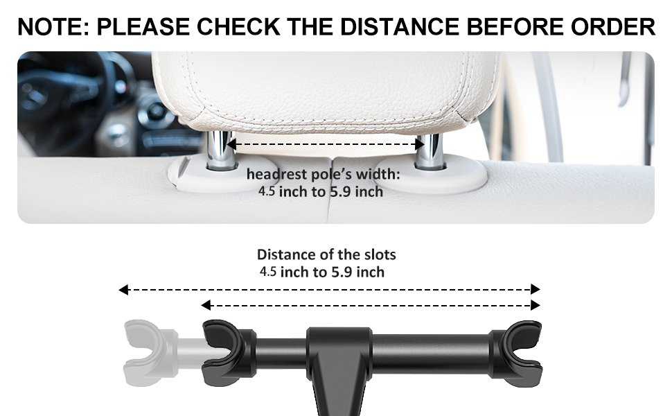 Please Note: The required poles distance is 4.5 inch to 5.9 inch(114mm-150mm), it means the width between two metal posts of your car headrest required 4.5-5.9 inch, please make sure the width before you order.
