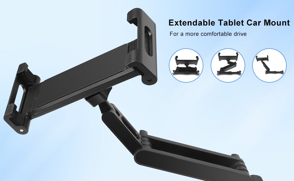 Adjustable Extension Arm: This tablet car holder is designed with an extendable arm joint, The adjustable extension arm allows you to position your tablet at the perfect distance, offering a comfortable viewing experience. tablet mount for car that can free your hands and backseat passengers can easier to enjoy movies, reading, games, and music during long road trip, and the driver can focus on the road and drive safely. It can be folded back against the backseat when not in use, saving space in the car.