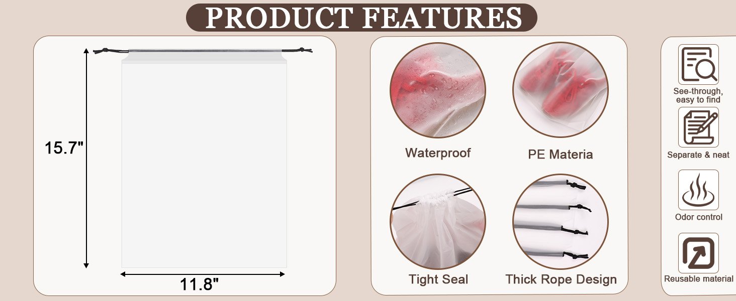 Estas bolsas para zapatos están hechas de PEVA grueso y resistente al desgarro. Son impermeables, reutilizables y mantienen los zapatos separados de la ropa durante viajes o almacenamiento.