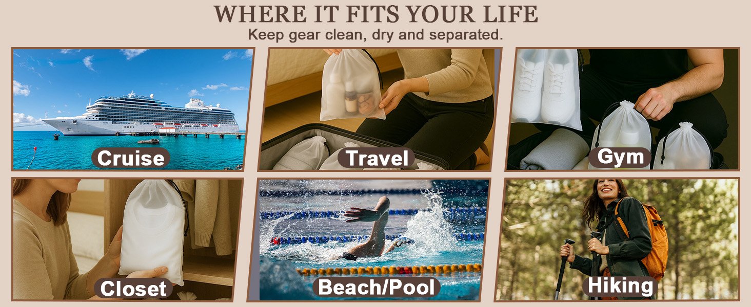 From Cruise to Gym — Versatile for cruises, gym, hiking, swimming, or closet storage. Separate wet from dry, keep clothes away from dirty soles, and pack faster.