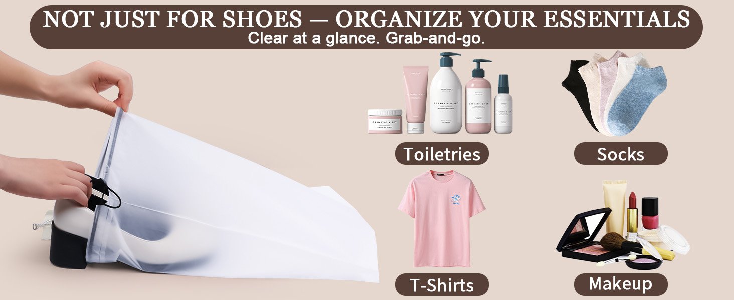 One bag, many uses: shoes plus toiletries/socks/tees/makeup; handles damp items like swimwear, beach sandals, small towels; daily carry for cables, travel bottles, toys, snacks; a one-bag-per-pair system keeps everything separate, clean, and easy to find.