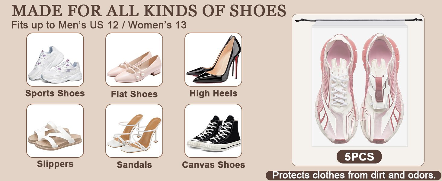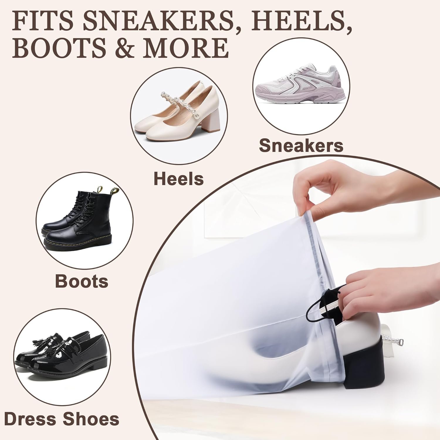 Fits Most Everyday Shoes — From sneakers and canvas shoes to heels, slippers, sandals, and flats. For bulky high-tops or platform boots, place heel-to-toe or use one shoe per bag for an easier close.