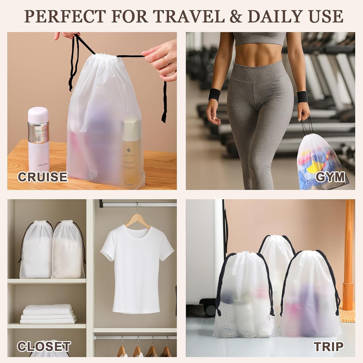 Set of 5 clear drawstring bags made of water-resistant PEVA. Keep dirt and splashes off your clothes and help contain odors. Foldable & reusable for every trip.