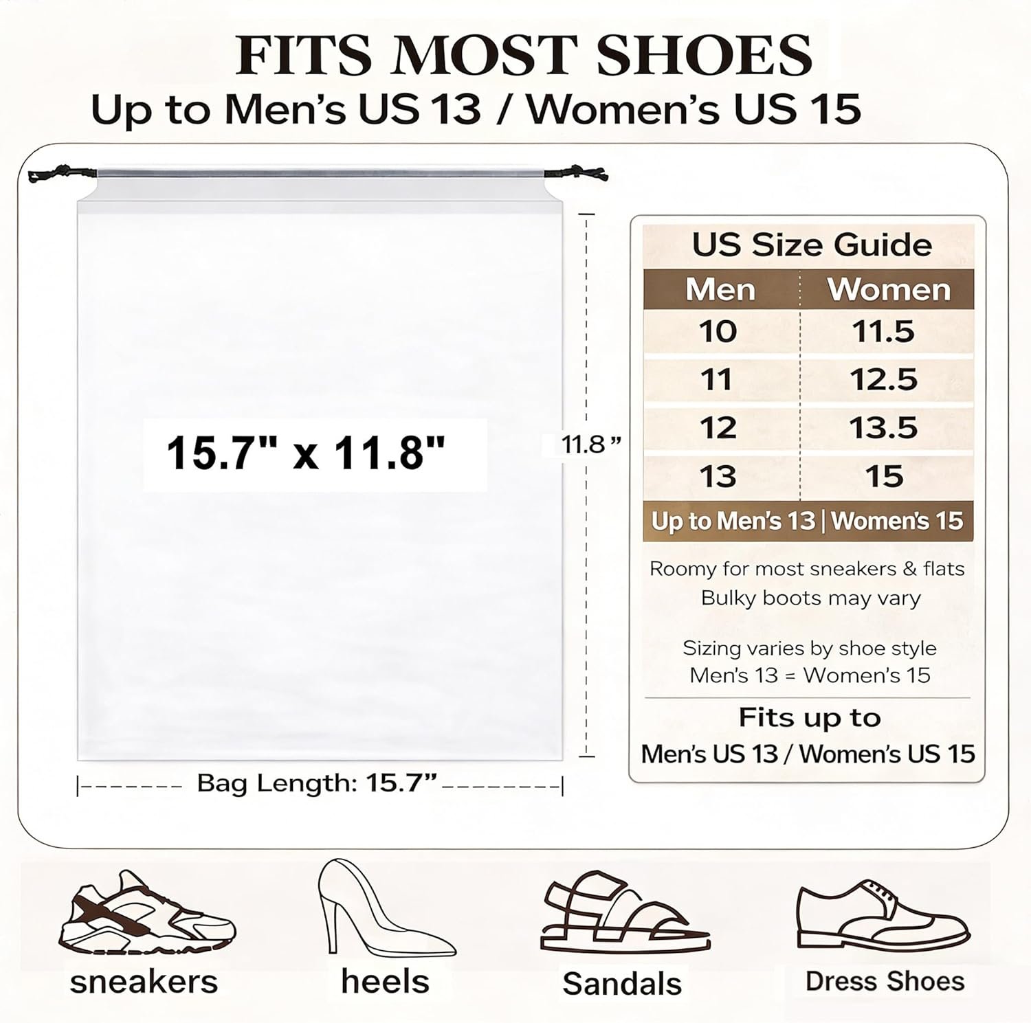 【Generous Size & Capacity】Each bag is 15.7″x11.8″ (40×30 cm) and fits most shoes up to Men’s 12–13 / Women’s 15. Fits: sneakers, running/training, dress shoes, loafers, flats, heels, sandals, ankle/mid boots. For bulky high-tops/platform boots, place heel-to-toe or use one shoe per bag.