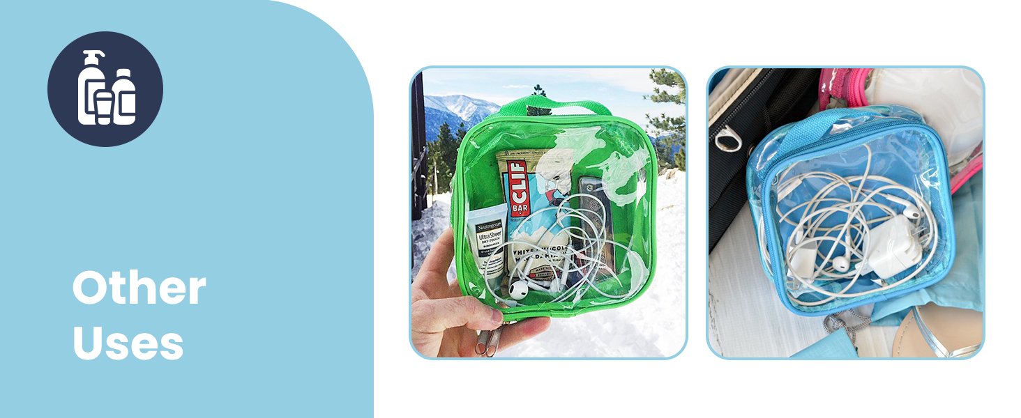 MULTIPLE USES: While it is ideal as a TSA approved travel bag, it can also be used to store electronics, phone chargers, house keys, and passports while traveling; The many colors enable the bag to be used as a toiletry bag for kids, a man’s toiletry bag and a woman’s toiletry travel bag; At home, use it at as a clear gym bag, as a small clear makeup bag, and more; If your shampoo bottle spills on the airplane, easily wash the bag with a warm wet cloth and soap