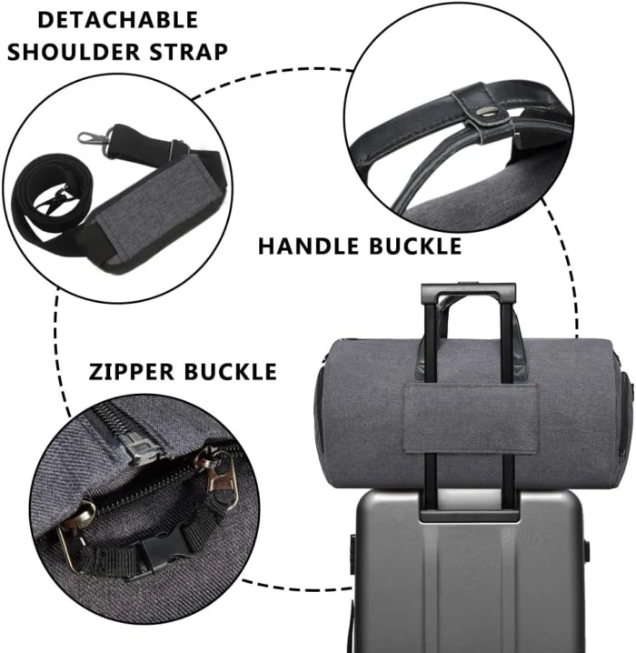 Reviewer: CalSailor Rating: 5.0 out of 5 stars Title: Unique bag that works well. Happy with the quality despite the low price. Review: The KEY THING is that I feel like this company makes different bulk runs of the bag with different materials and this is perhaps why the reviews are either stellar, or people express problems with the bag falling apart.This is a unique idea that works really well.This isn’t for an international trip. But how often do you need to bring a suit or a nice collared shirt for a change of clothes after work or on a weekend trip.I’ve found that for these quick trips a duffle bag works better than bulky luggage.This bag is the unique solution since I’m no longer 25 and sometimes need to bring some nice clothes along with my casual clothes on a weekend trip. It’s a great bag to throw in the trunk or take as a carryon.The build quality if decent for the price. I compared it to some similar bags that cost triple digits and yes this isn’t as fancy as those. But I don’t have $300 for a bag I might use a few times a year. This does the same job just as well, without the fancy brand name.Criticisms: The material quality isn’t top notch, but it’s above what I’d expect for this price and I have no concerns at all about the bag falling apart like other reviews have said. As for zippers, I actually bought 3 of these bags and all the zippers look fine. Maybe that means the brand has read the reviews and fixed those issues.As I said, I was confused by the multiple similar listings I found for what I thought was the same bag. So I ordered three and returned two of them.One of these bags came with a thin cloth material. One came with a much heavier higher quality cloth. And one with a thick faux leather. They all had slightly different buckles, hooks and zippers. They leather one had feet. They all were the same basic design but there were slight differences in the pattern of internal and external pockets, as well as the internal lining.I ultimately kept the leather one seeing as the handles and overall sewing and build quality seemed the best. However I actually think the thick fabric is the bag that will stand up to use the best and not show scuffs and marks like I worry the faux leather will. I guess time will tell!So I think my advice to everyone is that this is a good bag and worth the money. $30-40 makes you think you’re getting garbage but it’s actually quite a decent bag. If what arrives looks crappy or has crappy zippers then either someone is pushing knockoffs (my opinion, not a fact) or like I said the company may have had a bad bulk run. Don’t get upset , just order the same bag with a different material and you will be surprised. I have had no issues but as you see in other reviews the company has stood by their product. I just think to bring this to market for us at this price point they company sometimes understandably might miss the mark with a batch. Reviewer: Karen Rating: 5.0 out of 5 stars Title: Excellent convertible garment bag Review: Love it! Took on a cruise recently, I hung 2 dresses, 5 nice shirts, and a long sleeved shirt of my husbands. All in bags from the dry cleaners. Zipped it up and still had room for my skin care, makeup and 3 pairs of shoes. It went through airport baggage with no scratches. Hung the clothes right away. Perfect, I would buy again!Could have a stronger zipper. Nothing came apart for me. Reviewer: luke Rating: 4.0 out of 5 stars Title: nice carryon bag its worth it Review: It’s almost a five-star bag. The zipper could be a little heavier-duty, but I love the space and how much I can fit in this bag. Just don’t try to overfill it; there’s a chance the zipper will pop out. It’s not hard to put back in, though.I do recommend it if you need a nice, spacious bag—just don’t overfill it! It will fit in the carry-on compartment on a plane. I do like the shoe pocket and the quality of the material used. Reviewer: wareagle2334 Rating: 5.0 out of 5 stars Title: Great bag and perfect carry on Review: I have traveled with this bag twice now on the smaller Delta flights. You know the two-seaters on each side… IDK the name of them lol but you feel me.It fits very easily in the over head.Wrinkle-free I put 3, because maybe the size of my clothes but my shirts to wad up a little at the sleeves and side (or hey maybe I don’t know how to pack.).I have taken 3 dress shirts and two pairs of dress pants in the zip-up hanging clothes part. You can fold clothes to put in the middle for when you zip it up like a duffel bag. I was able to put 5-6 pairs of boxers, 3 undershirts, a regular t-shirt, and a couple of other small things.The separate shoe compartment is nice because I put a pair of dress shoes in it, all my socks, my pill organizer, and I cant remember if I put my small toiletry bag inside the shoe compartment of in the main bag part. Either way it all fit.There is also a compartment on the opposite in of the shoes to put a few small things as it is relatively flat. The outside has a small area that has two zippers (I didn’t bother to check the product description), but I believe this would do well if you wanted to unzip both and slide them onto the handle of your rolling suitcase. Trying to travel light I just unzipped the top and used it as a pocket for my phone, tickets, and receipts.Inside the bag, there are also a couple of other pockets. On my last trip, I had 2 polos, a button-up shirt, and 2 pairs of pants in the hang-up part. I didn’t need extra shoes so it worked really well for socks and all the other little things I needed. The small pocket inside I mentioned I put a belt rolled up in.Also, it has 3 zippers: one across the top to zip together the top and bottom ends where your hanging clothes meet, and one zipper for each side to enclose it. One thing I really like is there are 2 zippers on each end to close the ends up, and they have plastic clips that snap into each other to keep it fro