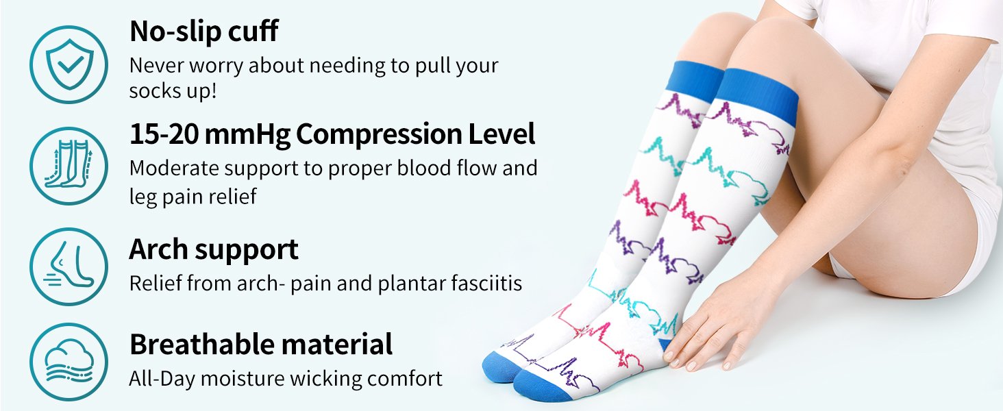 Review: I noticed relief the first day I wore these compression socks, and the difference became even more noticeable after a few days. I purchased the Bluemaple 6 Pack Copper Compression Socks for $16.99, which makes them a great value considering you get six pairs.For reference, I wear size 8½–9 shoes, I’m 5’5”, 200 lbs with slim calves and ankles, and the Small/Medium size fits perfectly.I bought them because I deal with shin pain, plantar fasciitis, and restless legs, especially when standing or walking for long periods. With these socks I can now walk longer distances and stand for hours with much less discomfort, although the pain does return when I take them off.The material feels thick and durable, made from polyester with compression spandex. They pull on easily if you roll them first and reach just below the knee. The compression is firm but comfortable, giving support without cutting off circulation or making my feet numb.Compared to some other compression socks I’ve tried, these feel slightly thicker and provide stronger support while still being comfortable enough for all-day wear.They’re also trendy and colorful, thin enough to wear comfortably with sneakers, so they don’t look like traditional medical compression socks.Overall, they’re comfortable, supportive, durable, and an excellent value for the price.