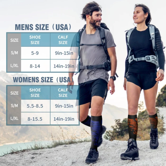 Review: Ordered the small/medium based off shoe size. Glad i did. When they first arrived I was skeptical that they would even fit, they do! They fit great, have the right amount of compression and my feet/legs don’t hurt nearly as bad as before after a 16 hour shift. I feel like they definitely improve the circulation in my feet and legs. Id say they’re pretty good quality. I was also worried that the embroidered designs would cause discomfort while wearing them, nope, nothing. And they stop right below the knee bend so I dont end up with sore spots in my knee bed from them. Awesome product, moves well.