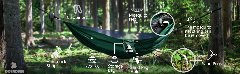 Why Choose Covacure Hammock The net can be removed. Made from high quality 210T parachute nylon. Comes with adjustable straps included. It is the best choice for an all-in-one hammock tent.
