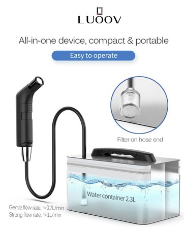 Review: I like that it is portable but the sprayer drips after use. I find a little puddle of water that dripped from the nozzle. Other than that it has a rubbery zipper bag to keep the water in so you need something sturdy to set it on. Mine is the bathroom counter. I like that it has 2 speeds & seems to work okay thus far. Came with sticky to attach to back of plastic holder for the sprayer which was nice. I don’t use it cause I lay the sprayer over the rubber water pouch so if it drips more it will go into the sink. Works for me.