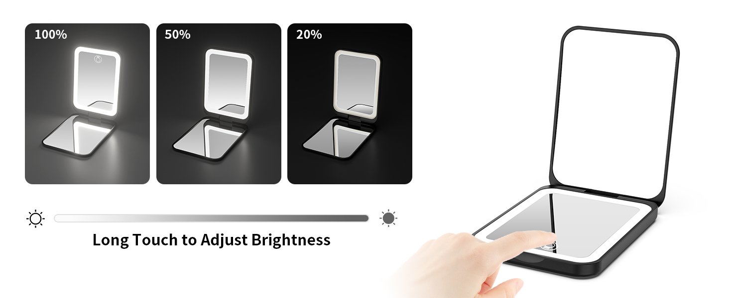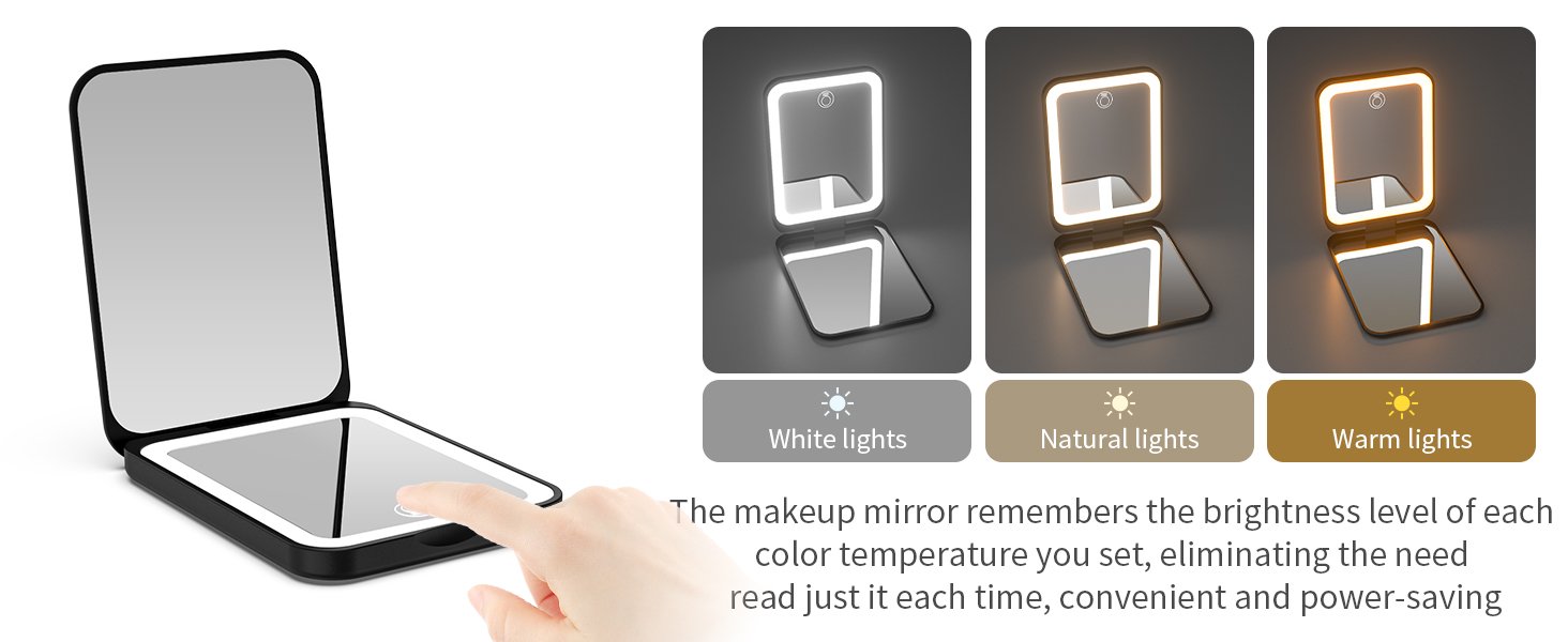 Reviewer: Amazon Customer Rating: 5.0 out of 5 stars Title: Excellent Purchase! Review: The mirror is super thin, compact and BRIGHT with a regular mirror as well as a magnifying one. It’s perfect from applying makeup, arching eyebrows, dermaplaning the face, plucking those pesky chin hairs…..lol…..just being able to things up close/better AND as an added bonus, it’s rechargeable versus having to use batteries. I’ve only had it less than a week, so at this time, I’m unaware as to how long it’ll keep a charge. The regular one that I travel with broke and I was just looking to replace it. I’ve never owned a lighted compact mirror, but so glad I found this little guy! Reviewer: Aaron D Rating: 5.0 out of 5 stars Title: Real good quality mirror! I love it! Review: I love this mirror! It’s the perfect size for my bag or pocket, it is bright with three beautiful light settings that can dim and brighten to your liking. The mirror quality is top notch with amazing clarity and real glass. I love the travel size and functionality and love the black outside color. The magnification and automatic closure upon closing the mirror is a great feature as well! I am buying some as gifts for friends and family. Reviewer: ALYNN Rating: 5.0 out of 5 stars Title: This amazing pocket mirror is a MUST BUY! Review: LOVE this mirror! Perfect size, quality, and color. Rechargeable (small USB charging cord included), magnification, 3 different light colors/shades, and adjustable brightness (not shown in pictures). It fulfills everything needed in a pocket mirror. If you are looking for a cute pocket mirror with these features, then this is the mirror for you! Reviewer: Shannon Cole Rating: 5.0 out of 5 stars Title: Great views Review: I bought these to give as gifts to my coworkers. They were a big hit. Every one loves a good mirror. Compact size with a super bright light. Love that its rechargeable too. Reviewer: Rational thinker. Rating: 4.0 out of 5 stars Title: Handy and compact. Review: Pretty simple and useful compact addition to the purse or bag. Holds a charge long. The light is on the regular mirror side and the magnifying side doesn’t have a light. I wish the hinge on it was tighter so it would stay more set at the angle you’d like. But for the price it’s worth it to have a little illuminated magnifying mirror handy. Would recommend. Reviewer: Robert T. Rating: 5.0 out of 5 stars Title: Good, great and useful! Review: Really helps if you have low light or no light at all to check out your face or shave. Three light settings with one amber lighting if the white light is too bright for you. Automatically shuts off when you close or use the touch switch. Reviewer: Wayne Y. Rating: 5.0 out of 5 stars Title: Great value Review: I bought this mirror to adjust the nasal pillows on my CPAP mask in the middle of the night if I feel or hear air leaking. It’s small but big enough to see and help me adjust the nose pillows in complete darkness with the built-in lights. When you turn it on, the lights light to the setting you had when you turned it off. My only complaint, but not a deal breaker is, because there isn’t a lot of border area to grab around both mirrors, it’s easy to get finger prints on the mirror. I saw mirrors with handles, but I went with compactness, and this mirror exceeded my expectation. The ability to charge the battery via USB versus having to change batteries is a great plus and keeps the size small. And being under $9.00 it’s a great value for the money. Reviewer: exist2read Rating: 5.0 out of 5 stars Title: Best pocket mirror ever. Would buy for gifts and self again ! Review: This is the best pocket mirror. It has several light options to help you see and the BEST PART? The lid is magnetized so that the teeezers will stock to the top. For me? This is a life saver because I often drop them- now? They stick to the pocket mirror .. the mirror is well built, keeps a charge for a long time (I STILL have not charged it after 2 weeks) and the color is great. Reviewer: C.J Rating: 5.0 out of 5 stars Title: Review: I’m so impressed with this Kintion mirror! It’s the perfect size—not too small, not too big—making it super portable and easy to carry in my purse. The lighting is fantastic with three color settings (warm, cool, and natural), and I love that the dimmest setting is actually dim enough for comfortable use. The 1X and 3X magnification options are great for both full-face and detailed touch-ups.Yes, it’s a bit on the pricier side, but I think it’s totally worth it. I’ll be bringing it everywhere with me, and it’s so much better than using my phone camera for makeup checks. If you’re looking for a compact, high-quality mirror that’s perfect for travel, this one’s a winner! Reviewer: Kyle Canada Rating: 5.0 out of 5 stars Title: Review: Wife loves this. The mirror’s magnification is perfect at 3x, the light is incredibly helpful, and the form factor is very nice. Fits in her small purse perfectly and takes up next to no space. The battery seems to last long and the recharging is easy and convenient. Good product: well designed and well made. Recommended. Reviewer: Jessica Rating: 5.0 out of 5 stars Title: Review: Nice quality and brightness. Even worked in a pinch as a light to see to unlock my door. Magnification is good without being rude about it, lol. All in all, nice product. Reviewer: catherine Rating: 5.0 out of 5 stars Title: Review: A nice little compact with light that is good for your purse or travelling. Reviewer: Amazon Customer Rating: 4.0 out of 5 stars Title: Review: Très bon produit, merci