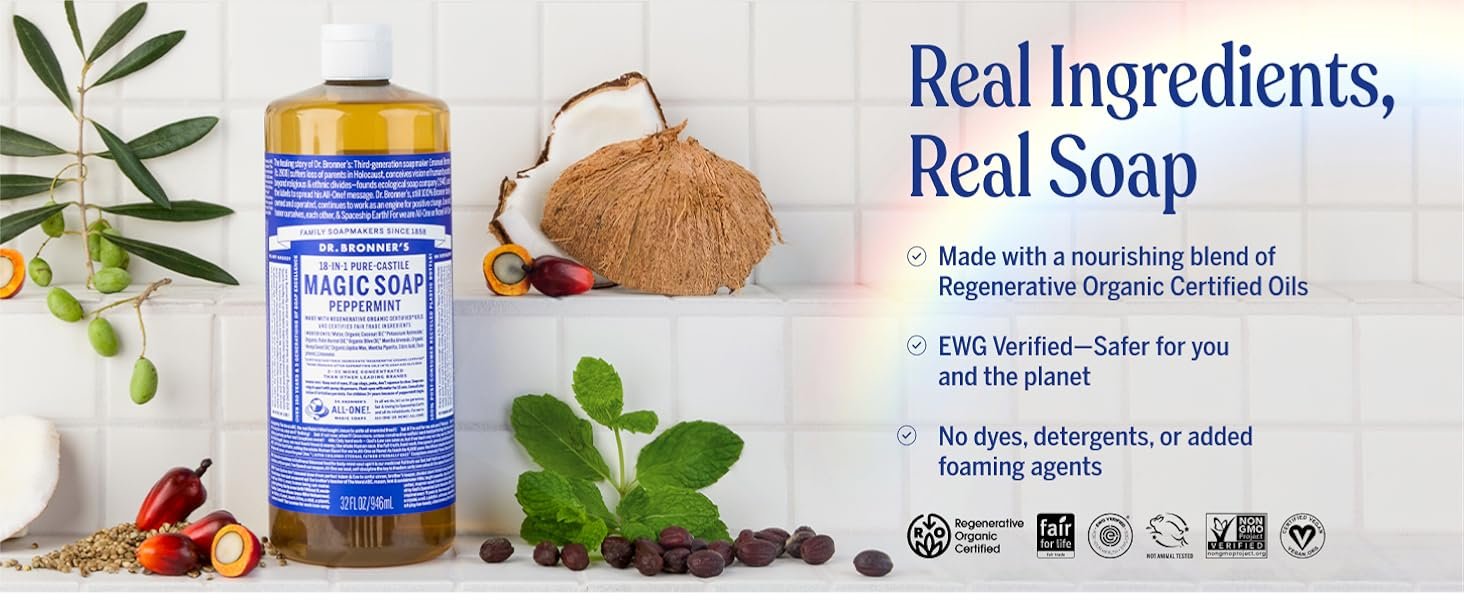 MADE WITH ORGANIC OILS & CERTIFIED FAIR TRADE INGREDIENTS: Dr. Bronner’s Pure-Castile Magic Soap are made with over 70% certified organic & fair trade ingredients—an ethical, sustainable choice and a gentle body and face wash for all!