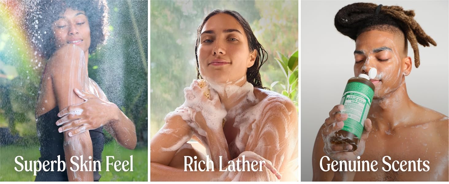 RICH LATHER, CLEAN FEEL: Dr. Bronner’s Pure-Castile Magic Liquid Soap is a true soap, with rich, thick lather that feels great on skin, rinses cleanly, and leaves your skin feeling refreshed and renewed