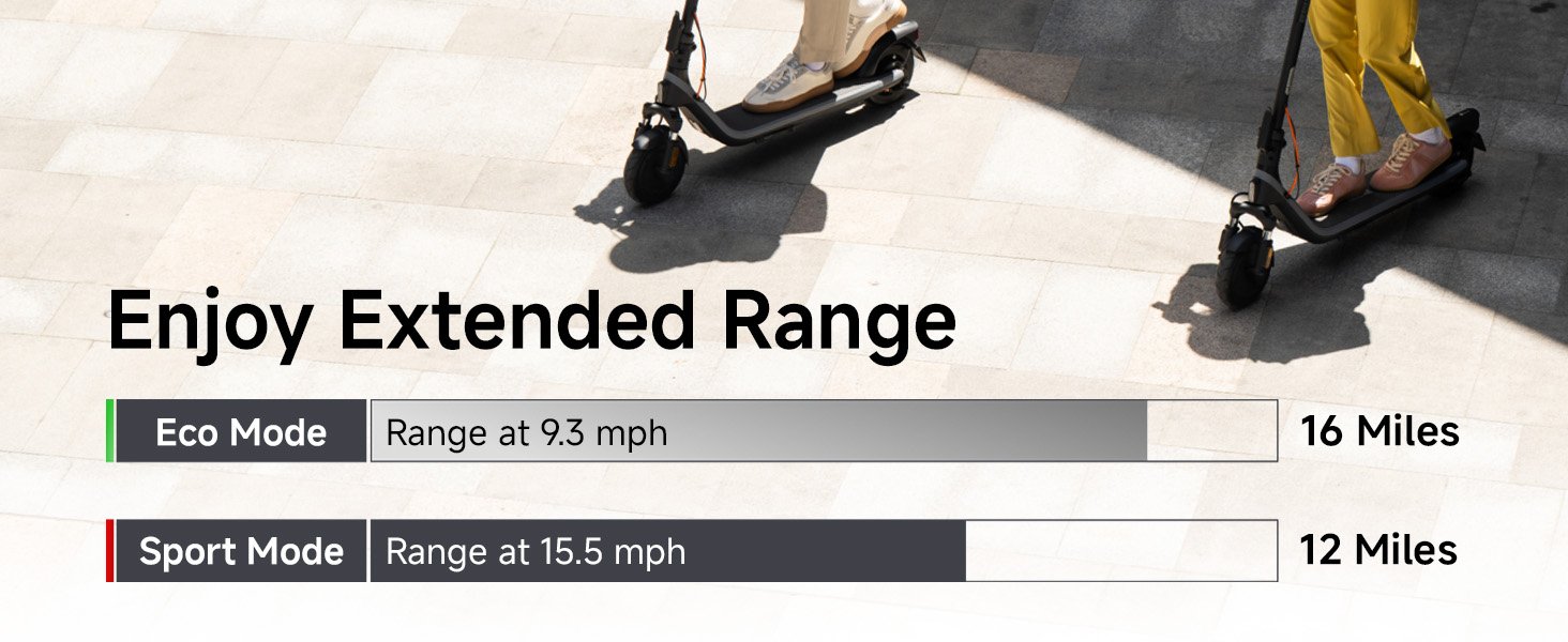16 Miles at Eco Mode, 12 Miles at Sport Mode