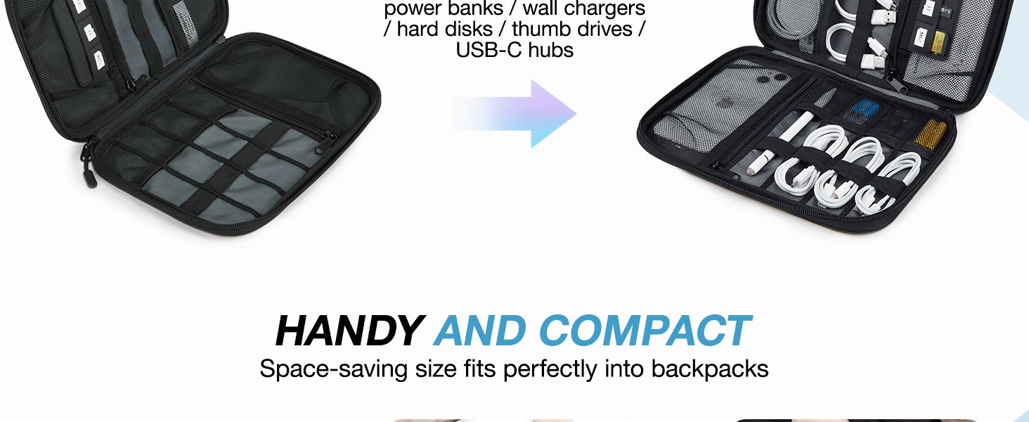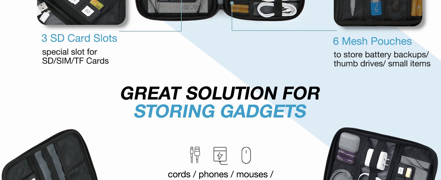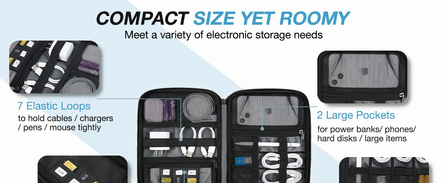 – Compatible Space: This electronics organizer bag features 2 zippered mesh pockets fits phones, standard power banks, 4 elastic loop pouches for small items, 2 elastic loop pouches for wireless headphones and small chargers. Elastic loops for phone charging cable. And specific slots for SD cards. Please check the size to ensure it meets your needs.