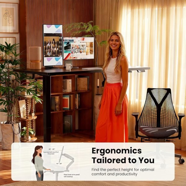 Electric Height Adjustable Standing Desk for Comfortable Work – Switch effortlessly between sitting and standing with this electric standing desk. The smooth height adjustment from 28.35″ to 46.46″ helps promote a more comfortable working posture and keeps your energy flowing throughout the workday. Ideal for home offices, gaming setups, and productivity workspaces. Powerful Motor with Memory Presets – Equipped with a quiet, powerful lift motor, this sit stand desk allows seamless adjustments at the touch of a button. Save up to 4 preferred height settings so you can instantly return to your perfect working position every time. Exceptional Stability Steel Frame – Built with a heavy-duty alloy steel frame and aerospace-grade lifting columns, this adjustable desk remains stable even at maximum height. Tested for 100,000 lift cycles, it delivers long-lasting durability for daily work, studying, or gaming. Easy Assembly & Low-VOC Materials – Designed with low-VOC materials to help reduce indoor emissions and create a healthier workspace. With simplified assembly and included tools, you can set up your new adjustable standing desk workstation quickly and start working comfortably. %$#