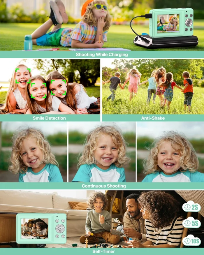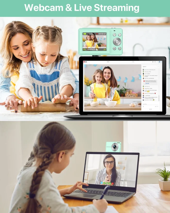 Review: Aesthetics: The camera has a very modern and minimalist design, with a striking turquoise or mint green color. This style makes it visually appealing, especially for users looking for a camera with a retro or vintage twist (like the popular “2000s digital cameras”) or a more fun alternative to smartphone cameras.Portability: Its format is ultra-compact, making it easy to carry in a small pocket or purse.Construction: The body appears to be plastic, which is typical in this range of cameras.Visible Key SpecificationsResolution: Indicates “44.0 MEGA PIXELS.” This is an extremely high resolution figure for an inexpensive compact camera. It is important to be cautious, as often this specification is an interpolation (a digital increase in the actual resolution of the sensor) and not the native resolution of the sensor, which is probably much lower (e.g. 8MP or 12MP).Lens/Zoom: “4x Powerful Zoom” is read around the lens ring. This suggests a 4x optical or digital zoom capability.Flash: Includes a built-in flash in the top right corner, essential for low-light photos.🎯 Public Target and UseThis type of camera is designed for:Beginners: It’s very easy to use; typically it only has a power button, shutter release, and mode button.”Look Retro” Content Creation: Ideal for users looking for the image and video style of early 2000s digital cameras, which has returned to fashion.Gifts or Secondary Cameras: A good option as a first gift of photography or as a camera that can be taken to places where you do not want to risk an expensive smartphone.✅ Points in favour (Potential)Attractive Color and Unique Design: It stands out from most cameras.Extremely portable: Very easy to carry.Ease of use: Ideal for aiming and shooting without the need for complex adjustments.