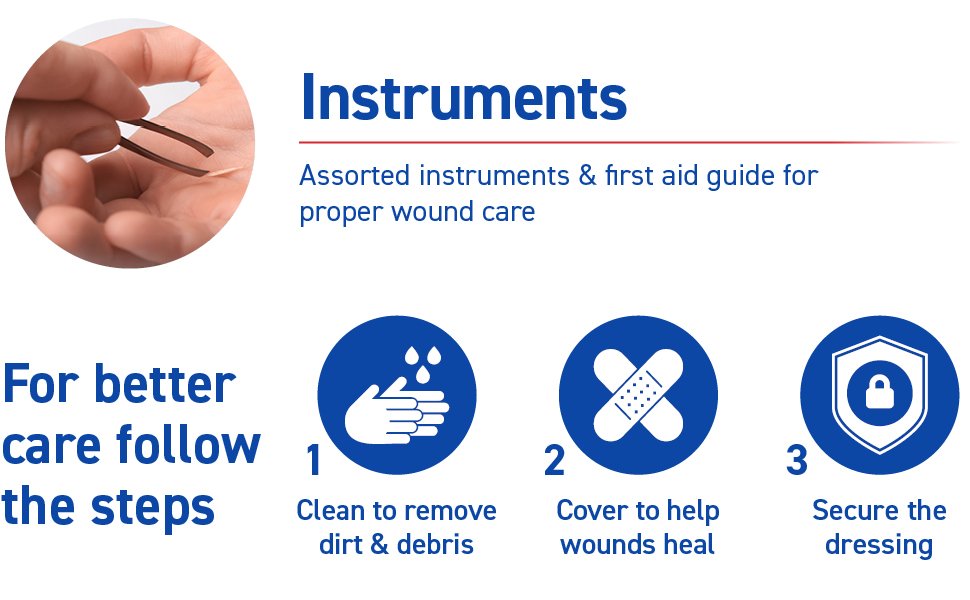 COMPREHENSIVE SELECTION of first aid supplies, including medicine, antiseptics, bandages, injury treatments, & a comprehensive first aid guide to help you administer first aid in a wide range of situations