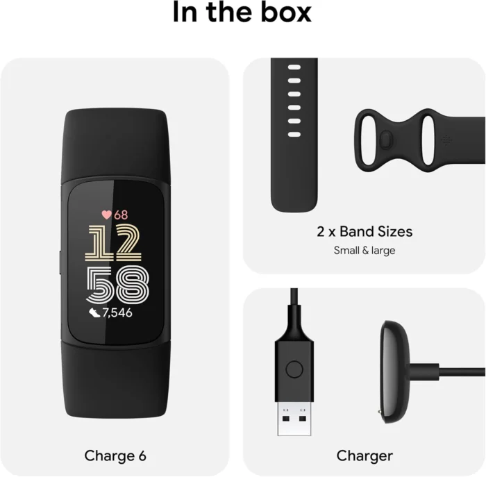 Fitbit Charge 6 Fitness Tracker with Google apps, Heart Rate on Exercise Equipment, 6-Months Premium Membership Included, GPS, Health Tools and More, Obsidian/Black, One Size (S & L Bands Included)