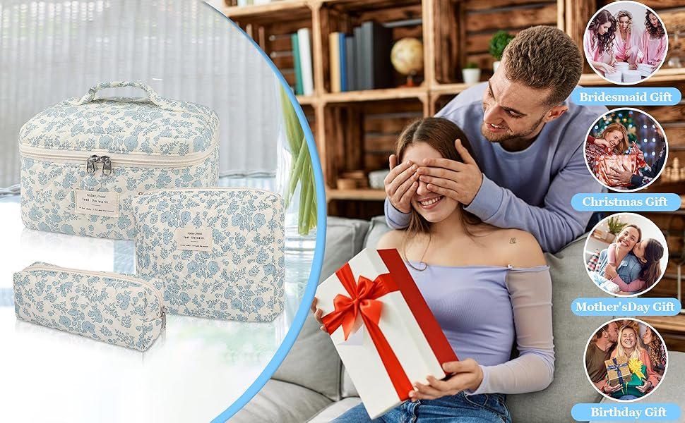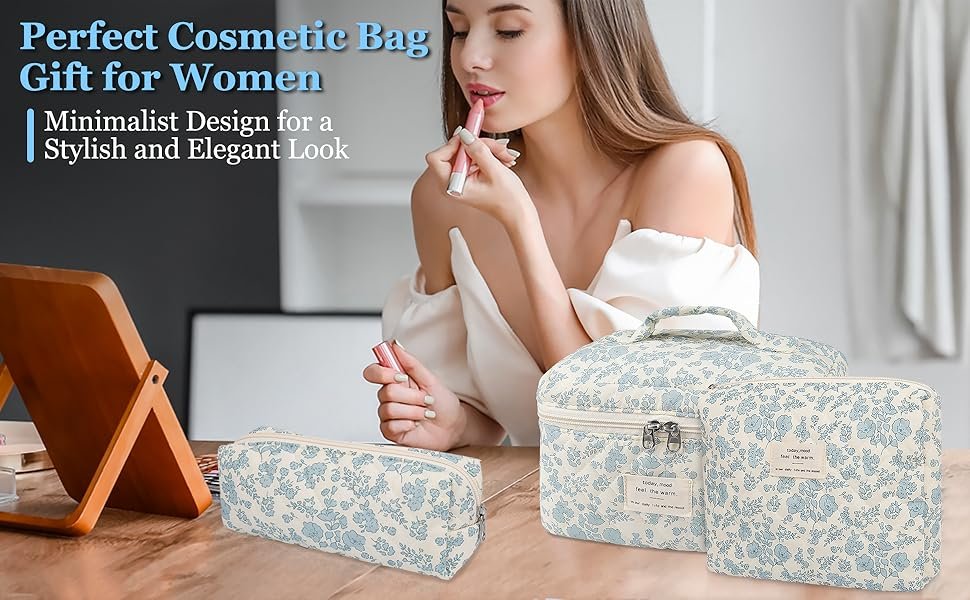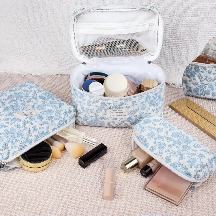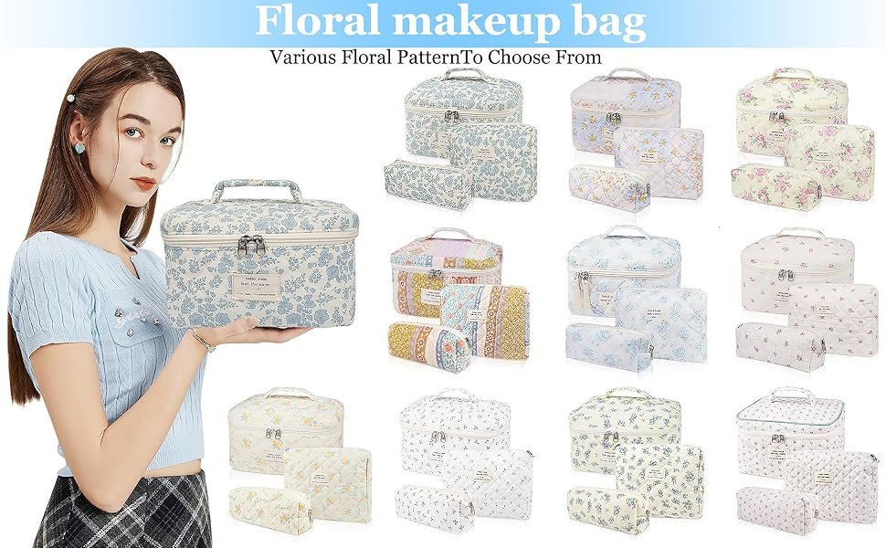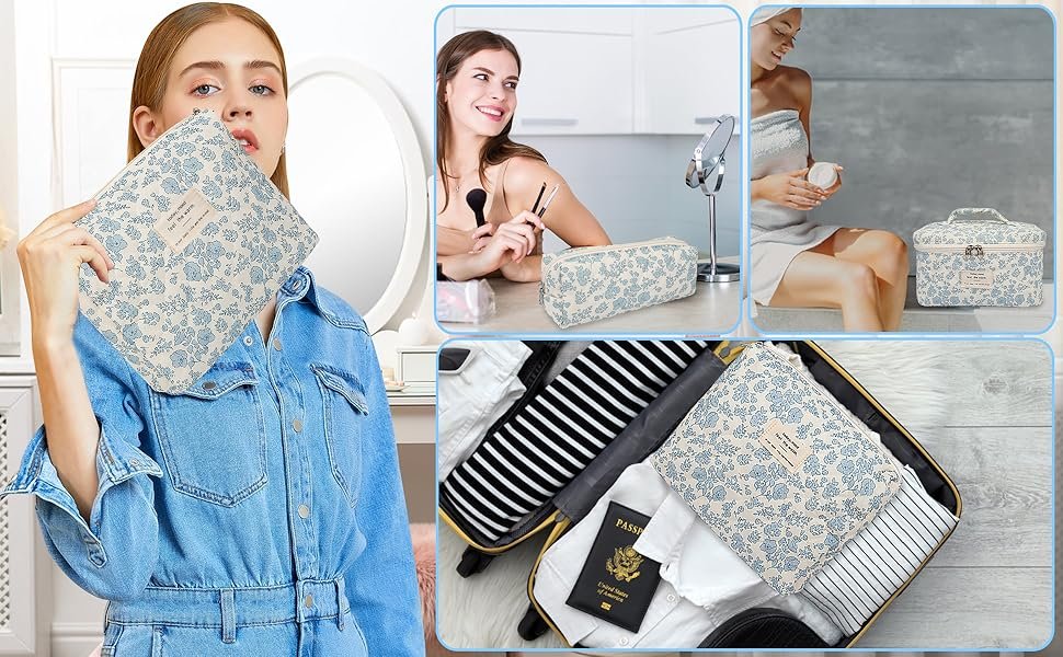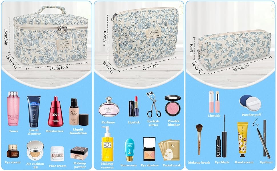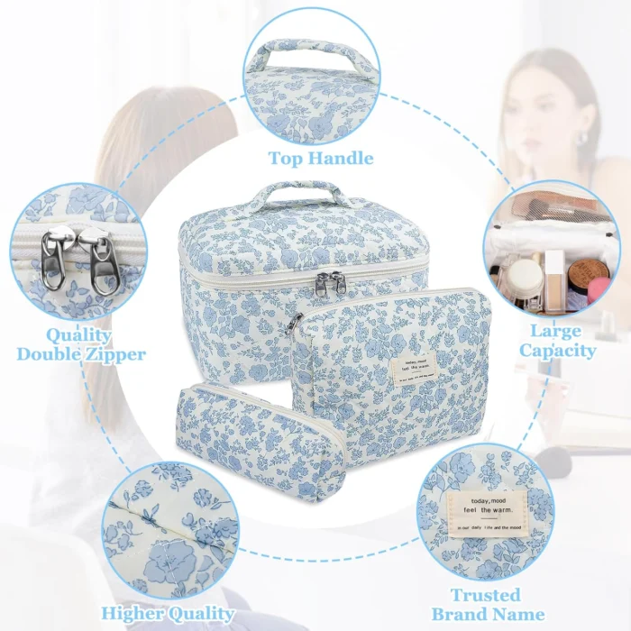 Makeup Bag, Large Quilted Cosmetic Bag, Big Floral Make Up Bag for Women Girls, Cute Cotton Makeup Bag Set, Flower Travel Toiletry Organizer Bag (Blue Flower)