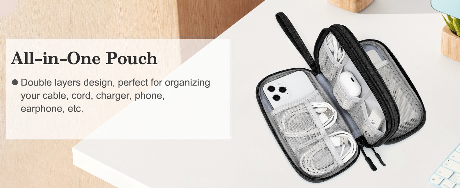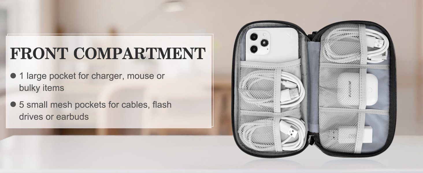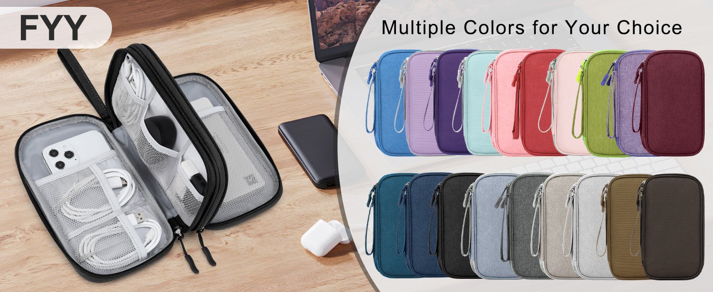 Reviewer: Amazon customer Rating: 5.0 out of 5 stars Title: VERY SATISFIED!! Review: I am so glad I ordered this organizer bag! From someone who used to have cords and charging blocks thrown around in the bottom of a bag- not anymore! This bag is perfect, easy to use and keeps everything all together and organized! It even has room for my charging banks! You won’t regret buying one! Totally worth the money! Reviewer: BabyPepe01 Rating: 5.0 out of 5 stars Title: Easy to keep me organize Review: I really like this FYY Electronic Organizer. Before using it, I was constantly disorganized with my cables and chargers—everything was tangled, and I never knew where to look. Now, everything has its place and it’s so much easier to find what I need.The bag is well made, sturdy, and the double layers give plenty of space for cables, chargers, earphones, and even my phone. I also like that it’s waterproof and compact enough to travel with, yet large enough to hold all my accessories.If you’re tired of digging through bags or drawers full of tangled cords, this organizer is totally worth it. Simple, practical, and very effective. Reviewer: Zee Rodríguez Rating: 4.0 out of 5 stars Title: Great travel cable pouch with smart compartments Review: I bought this product a few months ago for personal use and so far, so good. I travel pretty frequently (at least four times a year), and organization is huge for me – it helps keep travel easeful for me. I bought this pouch to finally stop scattering my cables and chargers in random pockets of my luggage, and after using it on three different trips, I can say I appreciate it.I like the compartments because everything has its place, nothing gets tangled, and I can access what I need quickly. I keep this pouch in my personal item so I can grab my phone charger at the airport, and if TSA ever asks me to pull out electronics, I just take out this one pouch instead of digging through my whole bag. It’s made my travel flow so much easier.The only thing I’d change is the thickness. When I store bulkier items (like cord bases or thicker chargers), it can be a little hard to zip. It still works fine, but I do wish the pouch had just a bit more depth for larger accessories. Overall, great storage, great compartments, and a huge upgrade to how I travel with tech. Reviewer: r.drew Rating: 5.0 out of 5 stars Title: Lots of storage for a good price! Review: We needed a good solid carrying case for all our charging cubes an cables for travel. We good the large size because we needed lots of storage capacity! Great quality build Solid but light weight with lots of storage pockets. Not a lot of padding but the shell is protective. Two compartments with good easy to zip and unzip. Nice price for the size and quality! Reviewer: Dennis Rating: 5.0 out of 5 stars Title: Awesome travel/overall wire organizer Review: Great case, loved it during my travels to have all my chargers and wires organized, I even use it to hold my passport and receipts. Keeps my charging brick, wires, AirPods Pro, passport and battery back in there easily. The zippers are basic and closure is good. I could do without the strap but it’s not hurting anything. It holds a lot for how small it is. Reviewer: Kelly Rating: 5.0 out of 5 stars Title: Small, but gets the job done. Review: This electronic cable organizer is quite compact, perfect for fitting in small spaces like carry-on luggage or a backpack. I chose the smallest size variant of this organizer.The downside to being so compact however was that my cables didn’t fit as neatly as I would have hoped into the compartments, I had to bend some of them a bit more than they felt natural to bend to fit in the compartments.It was especially apparent for one of my smallest length cable which was only a few inches long where a simple U was too long to fit but there wasn’t enough length to comfortably circle the cord over again, but I did it anyway to fit.I also wouldn’t suggest putting long cords in the small compartments. I have 2 of my longest usb cords in one of the lengthwise slots.This organizer did hold my INIU battery bank in it’s case perfectly, not a struggle to put in or take out, just fits comfortably in the pocket.It also held my older Galaxy S9 backup phone easily in one of the pockets as well. I’m sure it could also work as another battery bank spot as well.The organizer seems well made. The zippers are sturdy, slides and opens/closes easily, easy to grab and pull.I also appreciate that it doesn’t seem like the manufacturer or warehouse sprayed fungicides or fragrance on it which is great. It still has a “new” type of material smell to it but doesn’t smell like straight up fungicides like other cases I’ve bought have. For those with chemical sensitivity, you’ll know what I mean.I still give 5 stars because even though the smallest compartments were hard to fit my cables, I still managed to make it work, still does the job. It’s COMPACT afterall. I could have easily bought a bigger variant of this organizer if I wanted, but I wanted a super compact one, so my negatives points aren’t so surprising for limited space.If you want more comfortable space for your cables, just get a bigger variant of this. Problem solved. If you value compactness, this will still work. Just careful on how you bend your super short and super long cables.I did not test on waterproofness, but based off the material a minor spill looks like it won’t soak in right away so if you notice a spill in time your cables might be okay.In my pictures I have this cable organizer next to my clear 5″x7″ 3-1-1 liquid travel bag for reference. Reviewer: Jenn Rating: 5.0 out of 5 stars Title: Everyday use Review: We loved these. Ordered 3 different colors and it has been great for traveling. They are used on a daily basis,.for school, traveling and storing in one place, nice and neat. It’s small enough to fit in any of our bags and we keep on