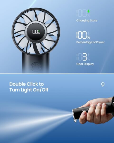 Gaiatop Portable Mini Fan, 3 Speed Handheld Fans with Power Display Flashlight, USB Rechargeable Battery, Lightweight Personal Cooling for Women Men Indoor Outdoor Travel Black