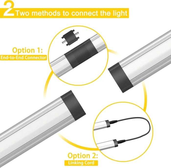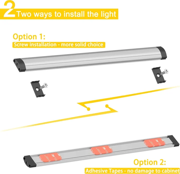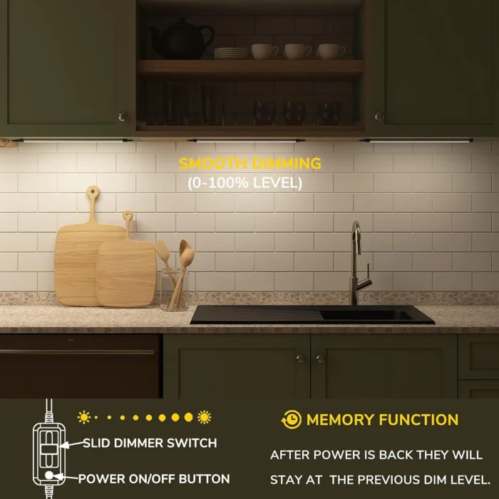 Reviewer: JK Jordan Rating: 5.0 out of 5 stars Title: great lights, easy to install, well-designed connectivity and controls. Review: In researching undercounter lights and asking around, I decided to order this set and am pleased with them.They were easy to install and the separate button switch and slide dimmer are perfect.I only needed three lights but bought the set of five. In case one fails some day, as electrical things sometimes do, I’ll have instant replacement light module.The light is easy and bright. Our whole family is happy with them. Reviewer: Amazon Customer Rating: 5.0 out of 5 stars Title: Works perfectly as described! Review: Easy install with adhesive, holds firm. Dimmer option is ideal. Great product for the price! Reviewer: Bobbi Rating: 5.0 out of 5 stars Title: Nice lights Review: I’ve tried many different under-the-cabinet lights. I tried several that were rechargeable. None of them had a charge that lasted more than a couple of days. To much of a pain to take them down and recharge as much as I do my cell phone. These are electric, easy to put up and have a dimmer on them so I can use them as tasks lighting or dim them for ambient lighting. I hid the cord with a cord hider I purchased at Lowes. They look great. Reviewer: G. Dodge Rating: 4.0 out of 5 stars Title: Decent Set, Fussy Installation Review: My complaints for these lights are few, and they’re all during installation.I highly recommend orienting/laying out the lights on a separate surface to later attach to where you want the lighting. I was working under a cabinet and it was exceptionally awkward, especially when things were not going smoothly. If I had mounted these lights onto a strip of something first, then installed the lighted strip where I wanted it, I would have had a much better time.That said, the power switch bit functions but it feels pretty cheap and doesn’t mount well. I have this unimpressive box of switch stuck on a cabinet, wires awkwardly leading off of it. The lights are solid, but for all their success, the switch box feels particularly makeshift. Reviewer: david whitney Rating: 5.0 out of 5 stars Title: Great for display cases Review: I installed these to light up my display cases in my store, and these work great. Nice and bright, easy to install, and cost a fraction of what they want for actual display case lights. Only complaint I have is the backing on the 3M tape is extremely hard to remove. Reviewer: Herb Bray Rating: 5.0 out of 5 stars Title: Highly Recommend Review: Highly recommend these lights. I have them under all my kitchen cabinets and they are bright but can dim to have on all night long also. Reviewer: lfholmer Rating: 5.0 out of 5 stars Title: Excellent Undercabinet Lights Review: My son and I installed 10 of these lights in his new kitchen. They were relatively easy to install if you have basic carpentry and electrical skills. We used the mechanical mounts, not willing to risk adhesive failures when the lamps heat up. The best advice is to layout the entire plan on paper or with software before starting. We also purchased additional low-voltage extensions and splitters and a short extension cord. Because this was a new build we installed a switched 120 VAC outlet above the cabinets, which made the final installation easier with a more finished appearance. The color, 5000°K, was just perfect for the new kitchen. BTW – we did not use the adjustable brightness. Reviewer: Amazon Customer Rating: 3.0 out of 5 stars Title: Good but not the very best Review: These worked great when I first purchased them. All my ceiling kitchen lights are behind me when standing at the counters so I used them very frequently so I can have light and see when doing almost anything in the kitchen. After a few months though they would suddenly stop working and the power block would get really hot. The cord length is great for smaller kitchens that have many cabinets together but that one odd small cabinet away from the rest, I had to get a pack and use one light with one cord and power block as the cords wouldn’t extend under my microwave. Installation was very easy and they stayed in place without a problem. They were nice and bright and light up the spaces perfectly. Mine for some reason did not dim, I tried the switch once and it never wanted to work again, could be I just got a faulty one but I needed a lot of light under my very dark cabinet areas so I didn’t really miss that feature. Durability wise; they didn’t stand the test of time and I had to replace them with a different type so I didn’t feel the cost was worth it. For small spaces you won’t use constantly and have a convenient outlet nearby, I would say these work great but if you need something that doesn’t bind you by a cord and will have high use for, I would skip. Reviewer: nauman aslam Rating: 5.0 out of 5 stars Title: Review: Installed this set in my kitchen , bright light , easy installation, wife loved it Reviewer: Amazon Customer Rating: 4.0 out of 5 stars Title: Review: Arrived when they said. Easy to install. Came with all installation parts and good easy to follow instructions. Works well Reviewer: James C Rating: 5.0 out of 5 stars Title: Review: Nice, bright and dimmable.Bought these after trying the wireless ones that kept failing. Reviewer: Denis Veillette Rating: 3.0 out of 5 stars Title: Review: Après seulement 1 an d’utilisation … elle ne fonctionne plus. J’suis un peu déçu. J’aurais aimé une meilleur qualité. Reviewer: billfern Rating: 5.0 out of 5 stars Title: Review: I bought these with unknown intent and placed under a cupboard assembly in my laundry room. Plenty bright enough but I had thought these lights had a motion detector and they don’t. So that kind of messed up the location issue. I moved them from the laundry room to the garage. It was a bit hard to break the seal on the two sided tape, but decided to work on the surface between the tape and the cupboard so a