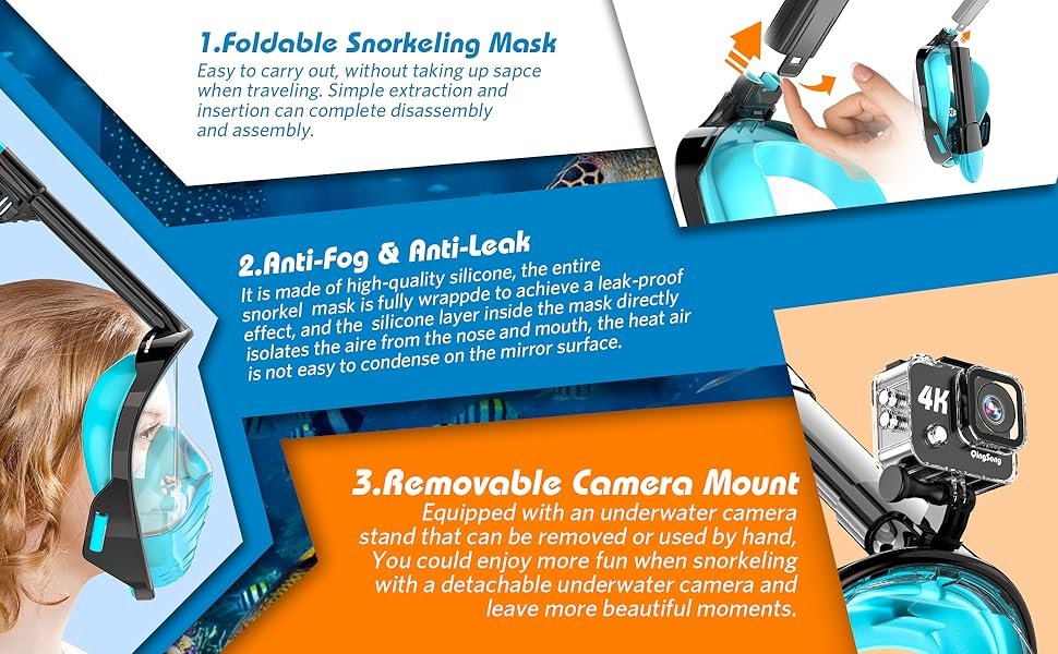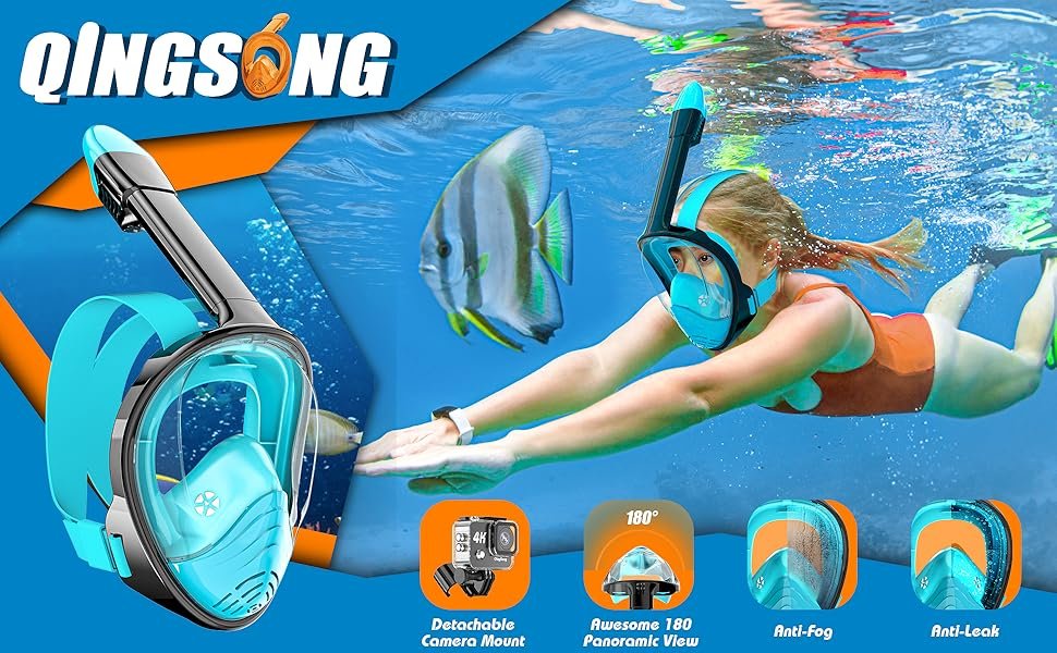 QingSong Full Face Snorkel Mask for Adults, Snorkeling Gear with Camera Mount, 180 Degree Panoramic View Snorkel Set Anti-Fog Anti-Leak