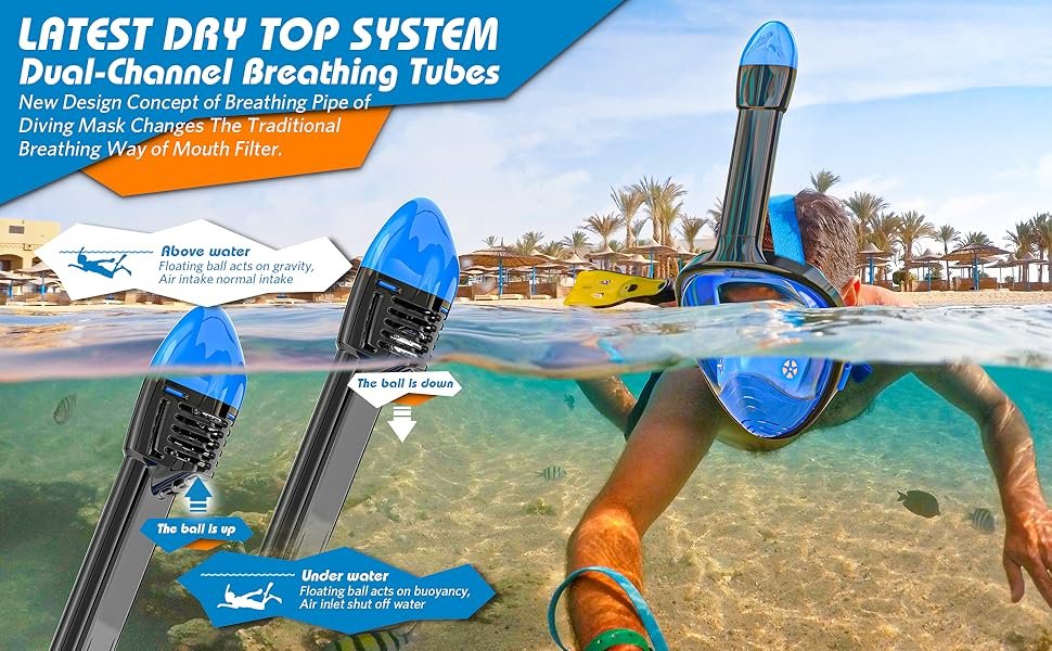 Review: I swim an hour a day, 5 days a week, summer and winter. I have a vertigo condition that presents me from turning my head side to side. In the past 20 years I have used every breathing mask/snorkel devise I could find. Prior to that I was a SCUBA diver in Hawaii, using different mask and breathing devices. Most work adequately but resulted in jaw stiffness biting sown on the snorkel mouth piece for an hour. I bought the full-face mask in April, 2020, and have a couple of hundred hours of use and experience with it. The following comments are based on the following conditions of my use. I swim either in a pool or calm freshwater lake, no open, wavy water. I have short hair and no beard. Using the mask sizing guide, I measure 5.0 inches, which is greater than 4.7 on the chart, so ordered an L/XL.PROs: 1. A single piece of equipment (plus the air tube). 2. Largest viewing area around. 3. Adequate air supply, for moderate exertion.CONs: 1. The single biggest concern is the tab used to “lock” the air tube to the mask. Once the tube is seated, the tab has to be pried back to remove the tube. This creates flex stress on the tab that eventually will cause it break. In the mean-time the tab is flexed away from the tube each time you use it, making a secure lock difficult. 2. There is on O ring where the tube attaches to the mask. If the O ring is not fitted absolutely perfectly it is almost impossible to get the tab to close over the locking hole. 3. When the air tube dips below the water line, even slightly, water (small amount) enters the mask across the top of the face plate. 4. No matter how tight or loose you tighten the straps, or how far up or down on the forehead you fit the mask, small rivelets of water seep in, requiring clearing the mask every 5 to 10 minutes 5. Most annoying to me, as a face-straight-down swimmer, is the angle of the air tube. At the current angle, when you are facing straight down, the air tube encounters the water and breathing is blocked. Consequently I have to swim with my head and neck cocked back 5 to 10 degrees, making for a stiff neck.I would rate this device an 11 if the air tube attachment tab/method was improved (an easy fix), the face seal thicker/softer, to allow for all the contours of the human face (a big ask), the air tube was angles back 5 to 10 degrees, and the (do-able ).OPINION: 1. Keep the clear face shield protected from scratches. Dry it inside and out immediately after each use, to keep it clear. 2. Minimize the number of times you remove the air tube, to protect the tab. At this point since I do not travel more than 100 yds with it, I never remove it. 3. Even though this is advertised as a “dual flow” air system, one way in another way out, I keep my mouth closed and inhale and exhale through my nose.