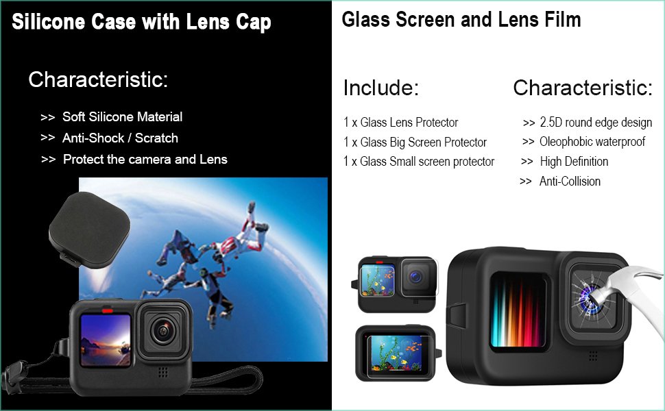 This Accessory Kit additionally contains the Waterproof Housing, Silicone Case, Glass Screen Protector for Gopro13 Gopro12 Gopro11 Gopro10 Gopro9.