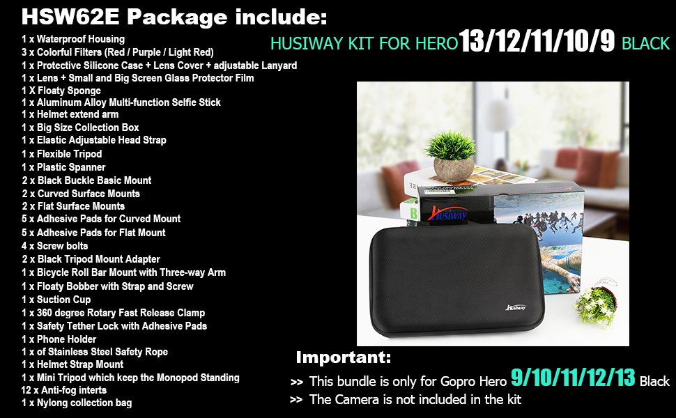 1 x Husiway OEM Colorbox, 1 x Waterproof Housing for Gopro Hero 13 / 12 / Hero 11 / Hero 10 / Hero 9 Black, 3 x Filters(Red / Purple / Light Red), 1 x Protective Silicone Case for Gopro13 Gopro12 Gopro11 Gopro10 Gopro9 , 1 x Aluminum Alloy Multi-function Selfie Stick, 1 x Mini Tripod which keep the Selfie Stick Standing, 1 x Helmet extend arm, 1 x 360 degree Rotary Fast Release Clamp, 1 x Phone Holder, 1 x Big Size Collection Box, 1 x Elastic Adjustable Head Strap, 1 x Bicycle Roll Bar Mount with Three-way Arm, 1 x Flexible Tripod, 1 x Plastic Spanner, 2 x Black Buckle Basic Mount, 4 x Screw bolts, 2 x Curved Surface Mounts, 2 x Flat Surface Mounts, 5 x Adhesive Pads for Curved Mount, 5 x Adhesive Pads for Flat Mount, 1 x Helmet Strap Mount, 1 x Suction Cup, 2 x Black Tripod Mount Adapter, 12 x Anti-fog interts, 1 x Floaty Sponge, 1 x Floaty Bobber with Strap and Screw, 1 x Nylong carry bag, 1 x Belt for Gopro Camera Remote, 1 x Safety Tether Lock with Adhesive Pads , 1 x Lens +Screen Glass Protector Film for Gopro Hero9 / Hero10 / Hero11 / Hero12 , 1 x Wipe cloth (used to clean the screen) , 2 x Wipes , 1 x Stainless Steel Safety Rope.
