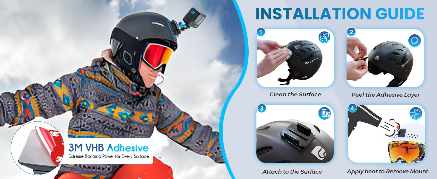 Removable adhesive sticker pads: The adhesive mount can be cleanly removed by applying heat (e.g. using a hair dryer) to adhesive bond to peel it off the mount with total ease. Ideal for motorcycle, skateboarding and snowboard mount, for curved and flat surface types.