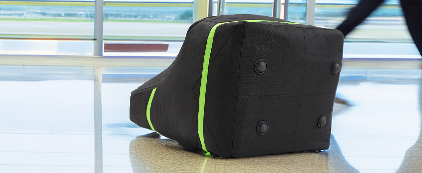 The car seat travel bag for airplane offers two comfortable carrying options — padded backpack straps and a top handle. The bag also has reinforced grip feet and a built-in ID tag make it easy to stand upright and identify at baggage claim.