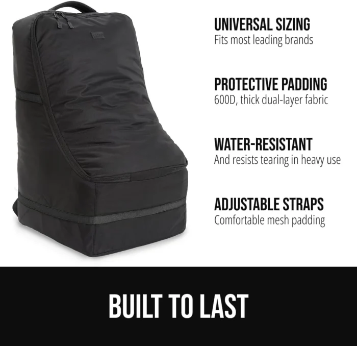 DURABLE, DUAL LAYER FABRIC AND PROTECTIVE PADDING: the heavy-duty car seat travel bag is designed with thick, 600D dual layer fabric and internal padding to help protect car seats from impact, scratches, damage, and rough handling; resistant exterior helps keep out debris during rigorous travel days; perfect for airports, baggage checks, and gate drops