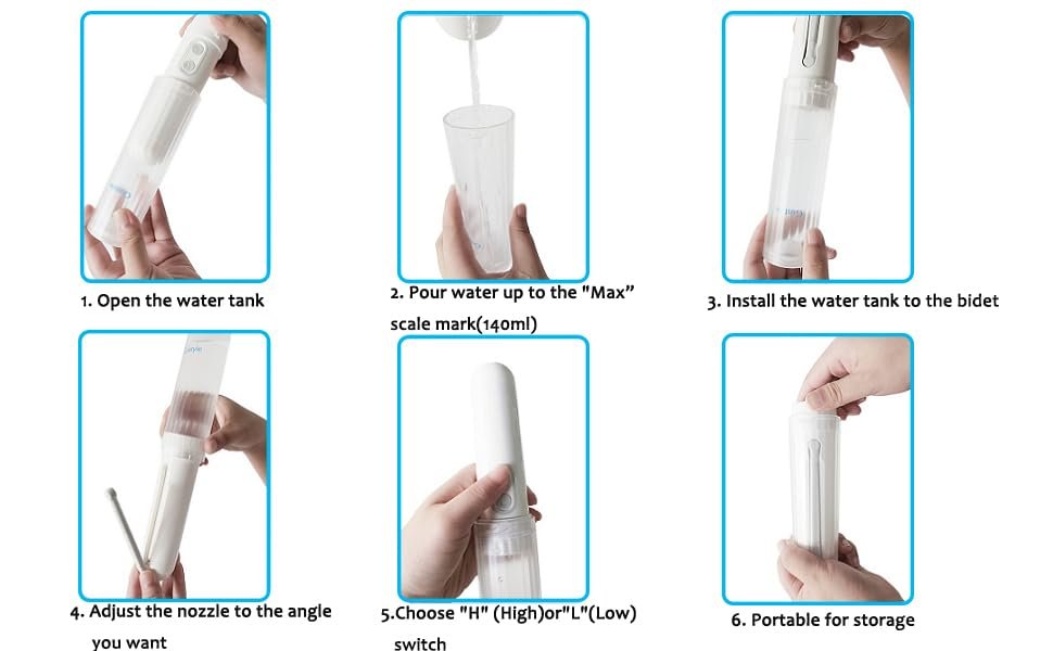 Product Manual:The main interface of the product is H (strong), L (low) touch cycle switch.Products continue to work 60s, the power cut off automatic to avoid water shortages, work again need to restartWhen replacing the battery, turn the battery cover counterclockwise to open and turn the battery cover clockwise when finished.The product uses 2 AAA dry batteries (the battery is not included in the package) The package contains:1 * 2nd generation portable travel bidet 1* Manual Specifications: Material: silicone + ABS + PC Size: φ47 * 156mm Weight: 215g Volume: 140ml Waterproof rating: IPX6 Full charge L file average water: ≥ 110mL / min Full charge H file average water: ≥ 150mL / minHOW TO USE