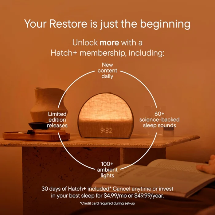 Hatch+ is an optional subscription that gives you access to exclusive sleep content. Your Restore comes with a free 30 day trial that renews at $49.99/year or $4.99/month. Cancel anytime.