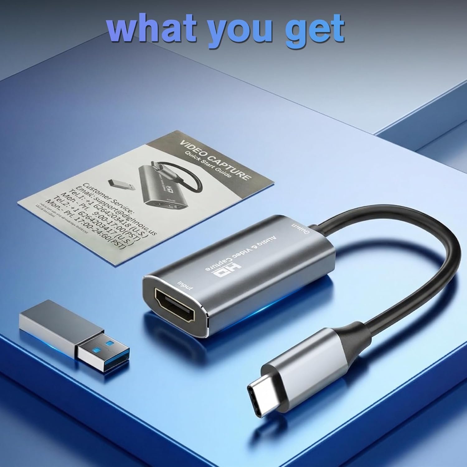 【What You Get】Includes: HDMI Capture Card, USB 3.0 to USB-C Adapter, User Manual. Tips: Make sure your tablet’s OTG function is enabled before connecting. Test your HDMI device with a monitor first to confirm video and audio output, then connect to the Video Capture Card for recording. %$#