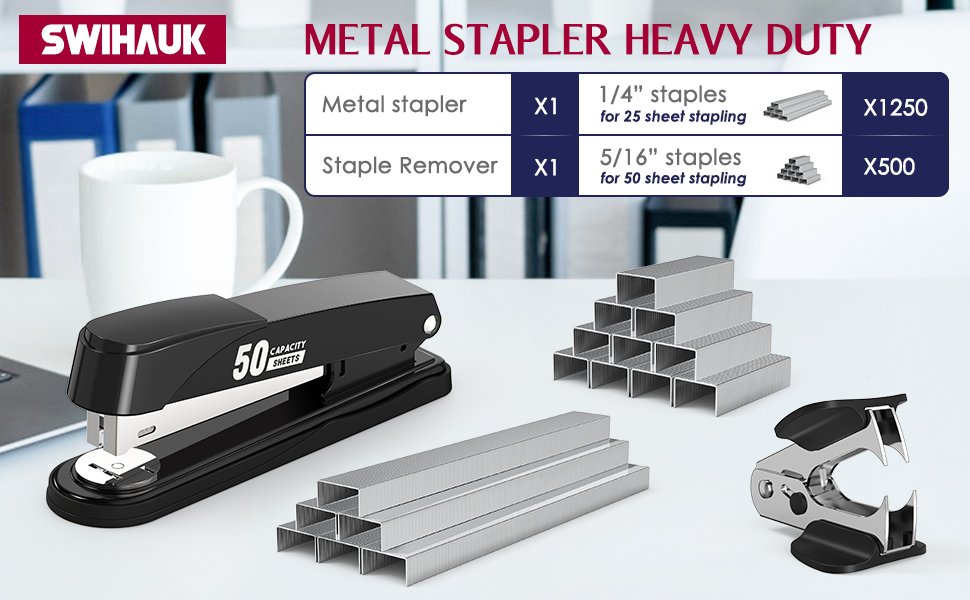 Swihauk stapler heavy duty with metal structure ensures high quality no-jam stapling and long term use. This value package includes 1 metal staper, 1 staple remover & 1750 staples.